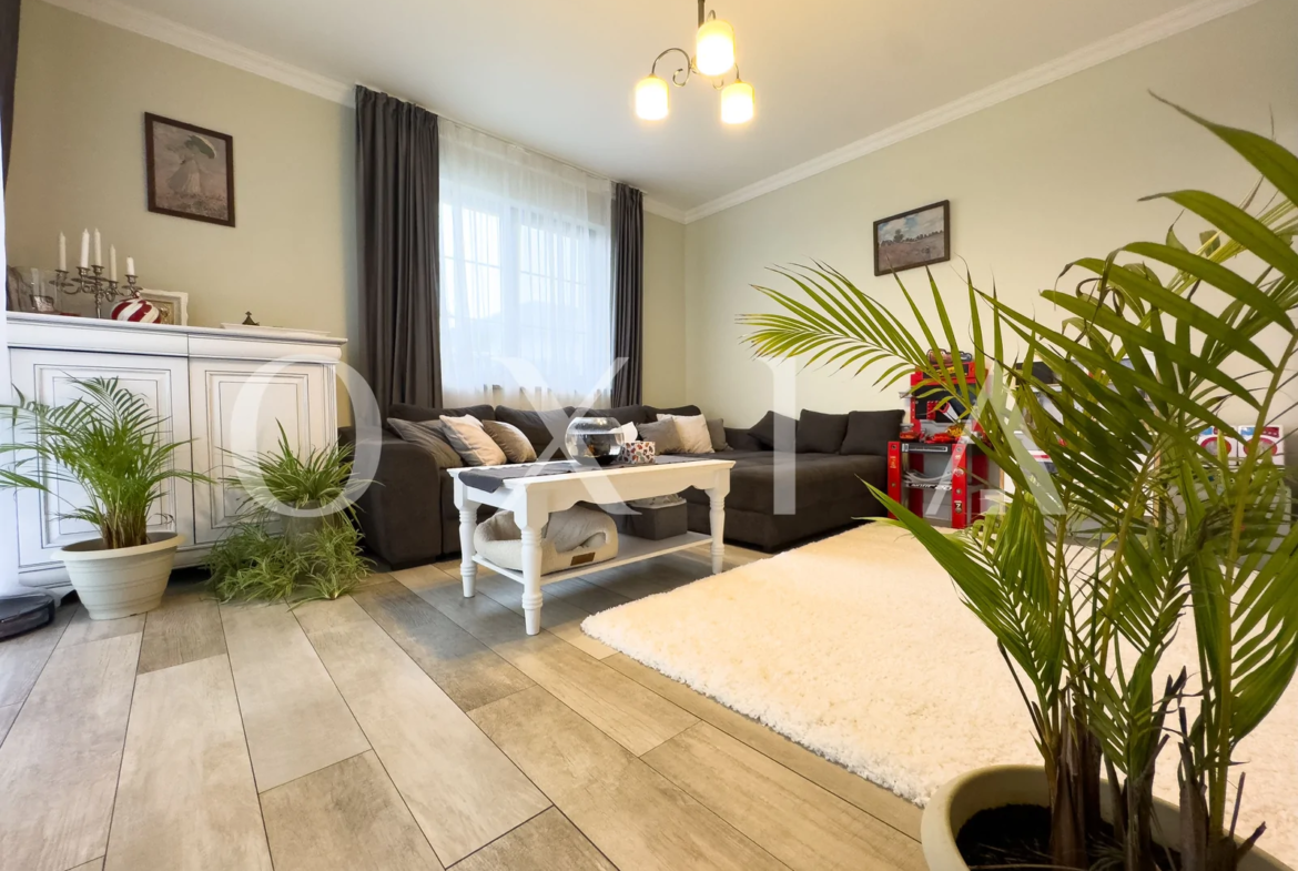 Casa se vinde mobilata si utilata ( mobilier bucatarie cu fronturi MDF, electrocasnice Bosch si Samsung ).