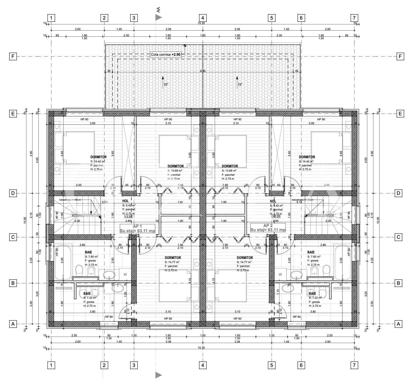 Etaj: hol, dormitor cu baie proprie, 2 dormitoare, 1 baie.