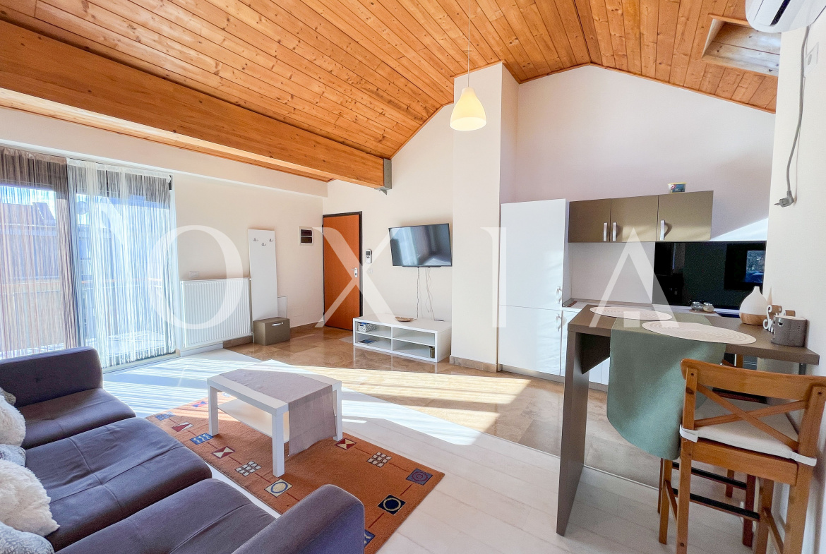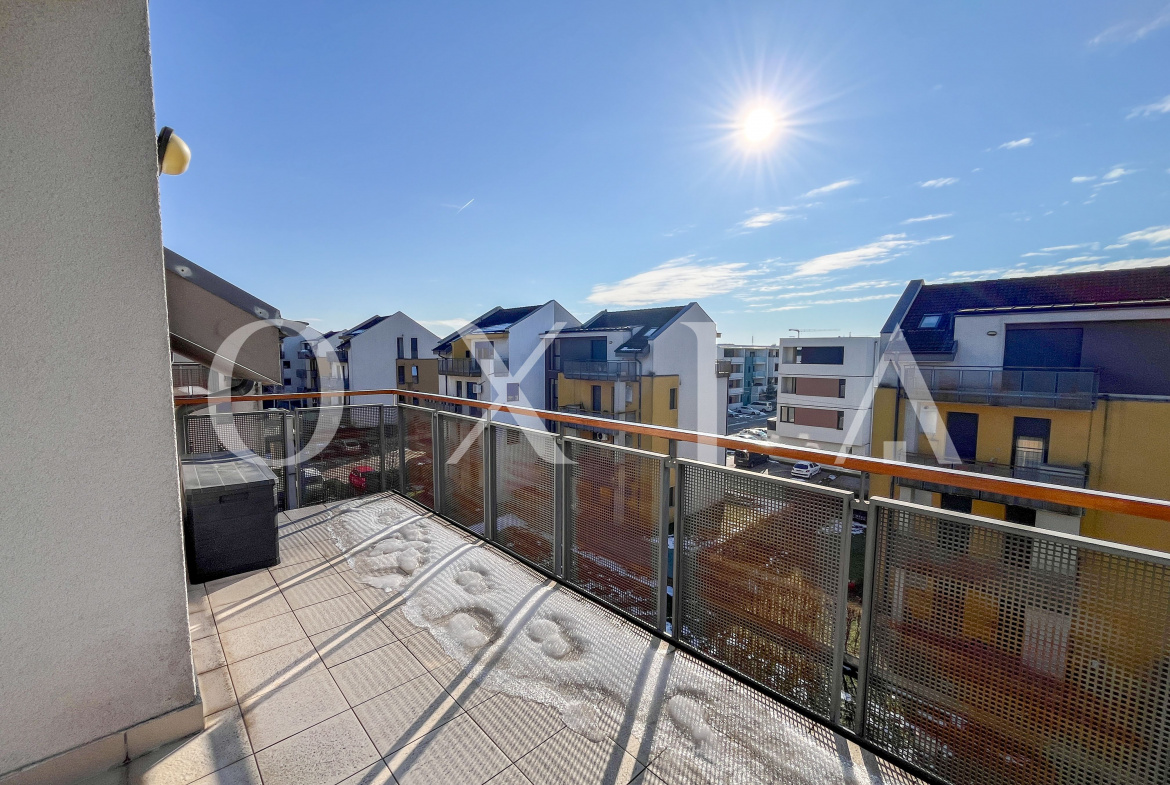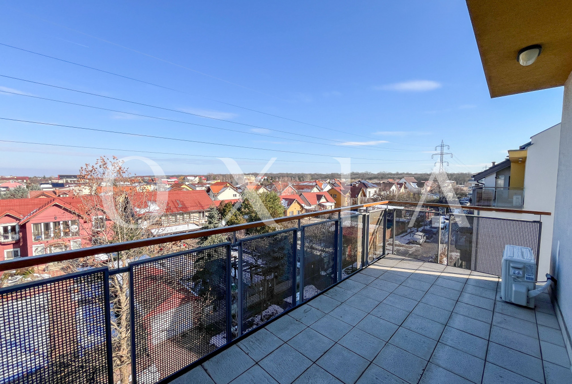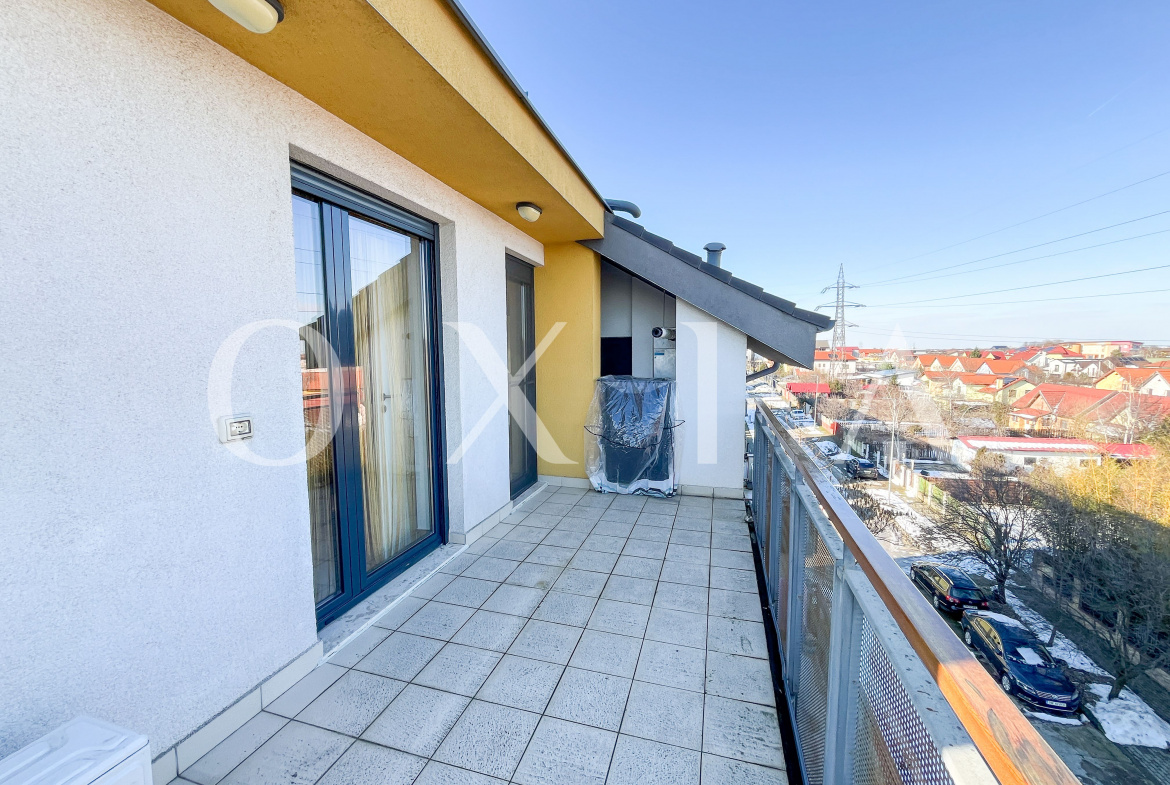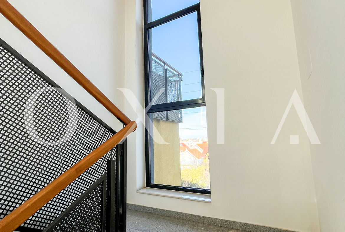 Locuinta beneficiaza de ferestre suplimentare Velux actionate electric prin telecomanda, tamplarie din aluminiu, usi interioare Porta Doors si se inchiriaza complet mobilata si utilata.