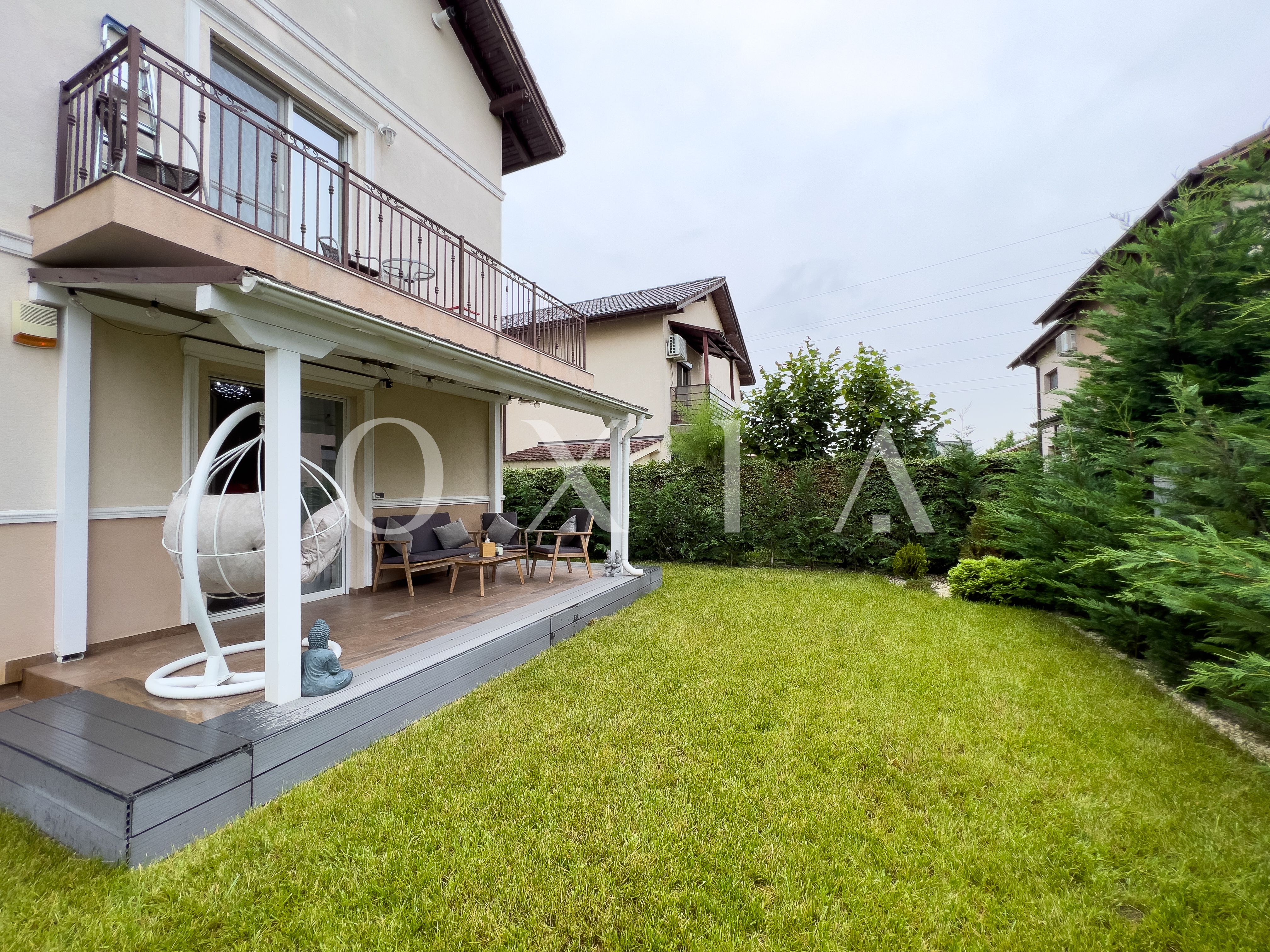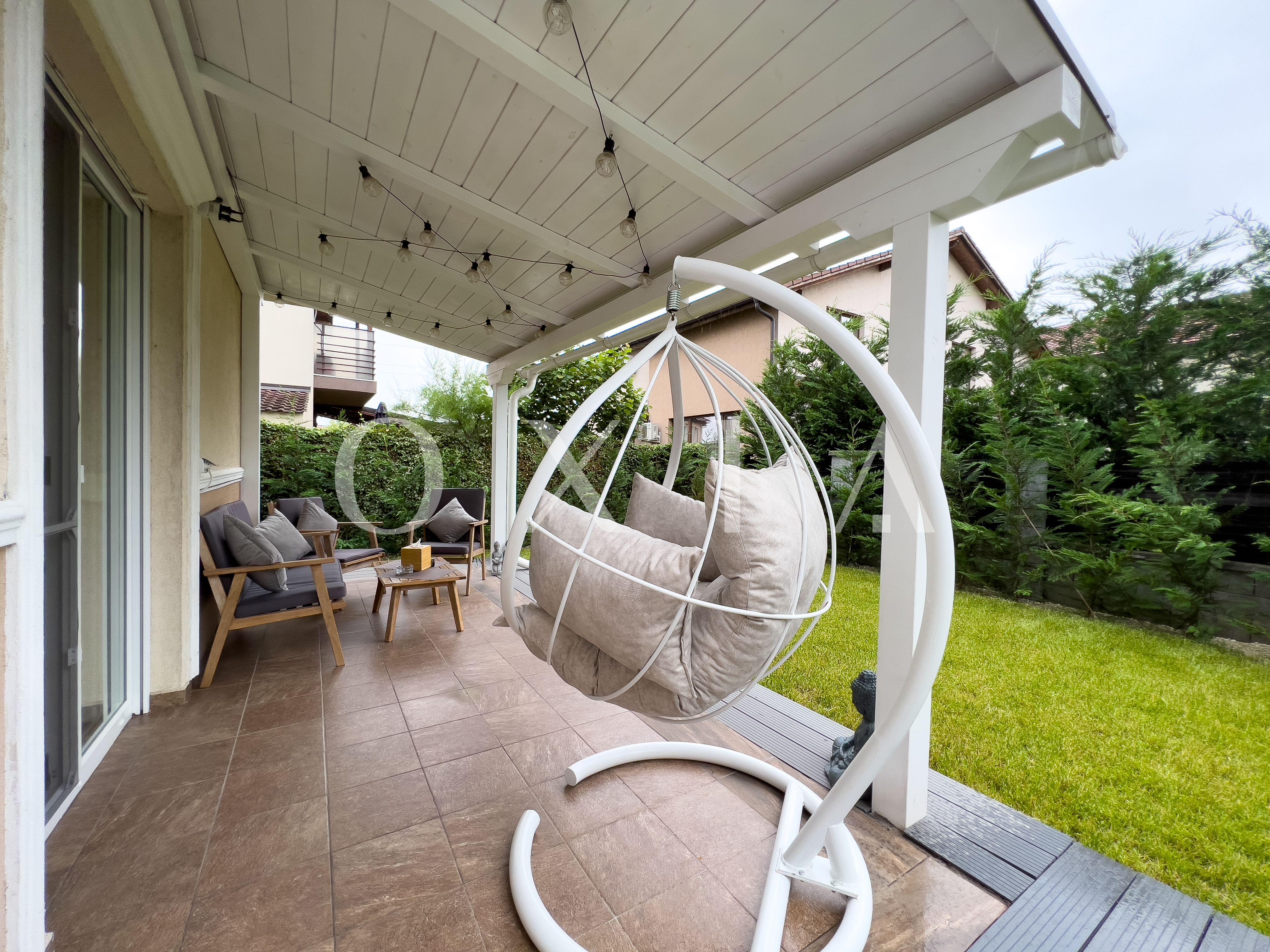 Apartamentul se inchiriaza complet mobilat si utilat, gata sa va primeasca. Dotarile de lux includ un frigider pentru vinur, masina de spalat vase si un semineu electric. Terasa este acoperita, iar spatiul exterior este amenajat cu brazi si plante, creand un mediu natural deosebit.