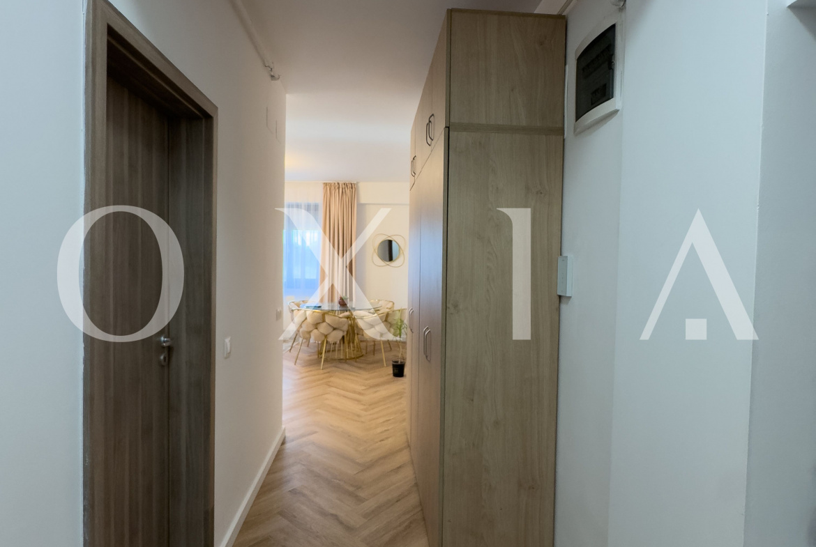 Apartamentul beneficiaza de finisaje moderne: usa metalica la intrare, usi interioare celulare, parchet LVT, gresie si faianta, tamplarie PVC cu geam termopan, rulouri exterioare din PVC, pereti finisati cu vopsea lavabila.
