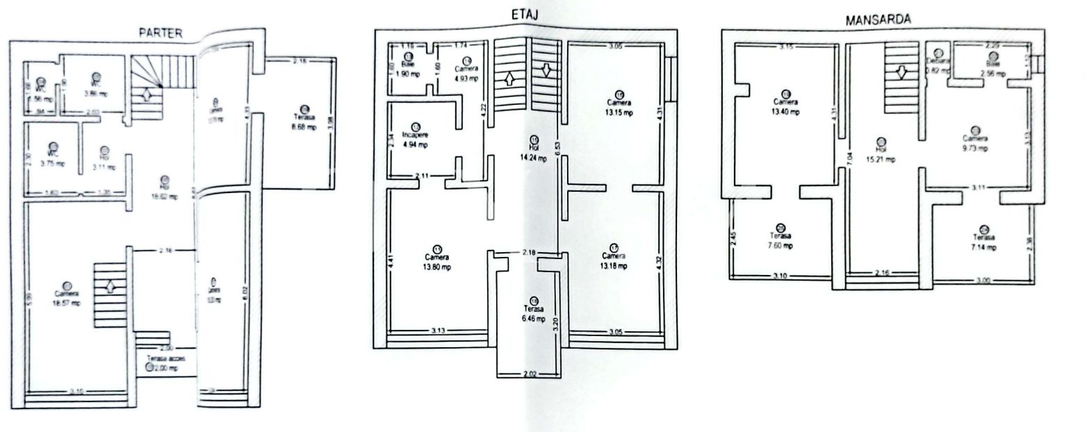 Mansarda: 2 incaperi, 2 bai cu dus si grup sanitar, 2 terase si 1 hol