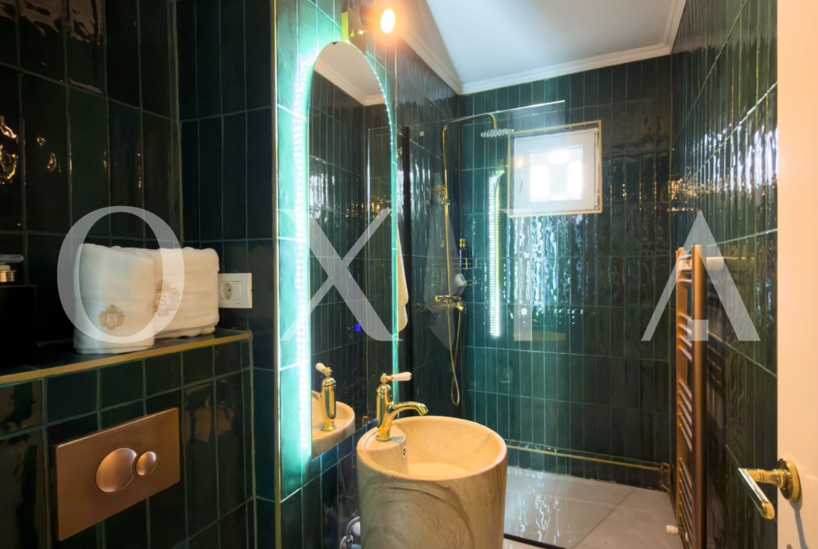 – baie cu zona de dus tip walk-in, delimitata cu panou din sticla, si geam pentru aerisire naturala