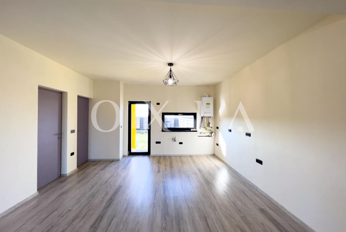 Parter: hol acces, living cu dining si bucatarie open space, baie, depozitare sub scara cu loc pt masina de spalat.