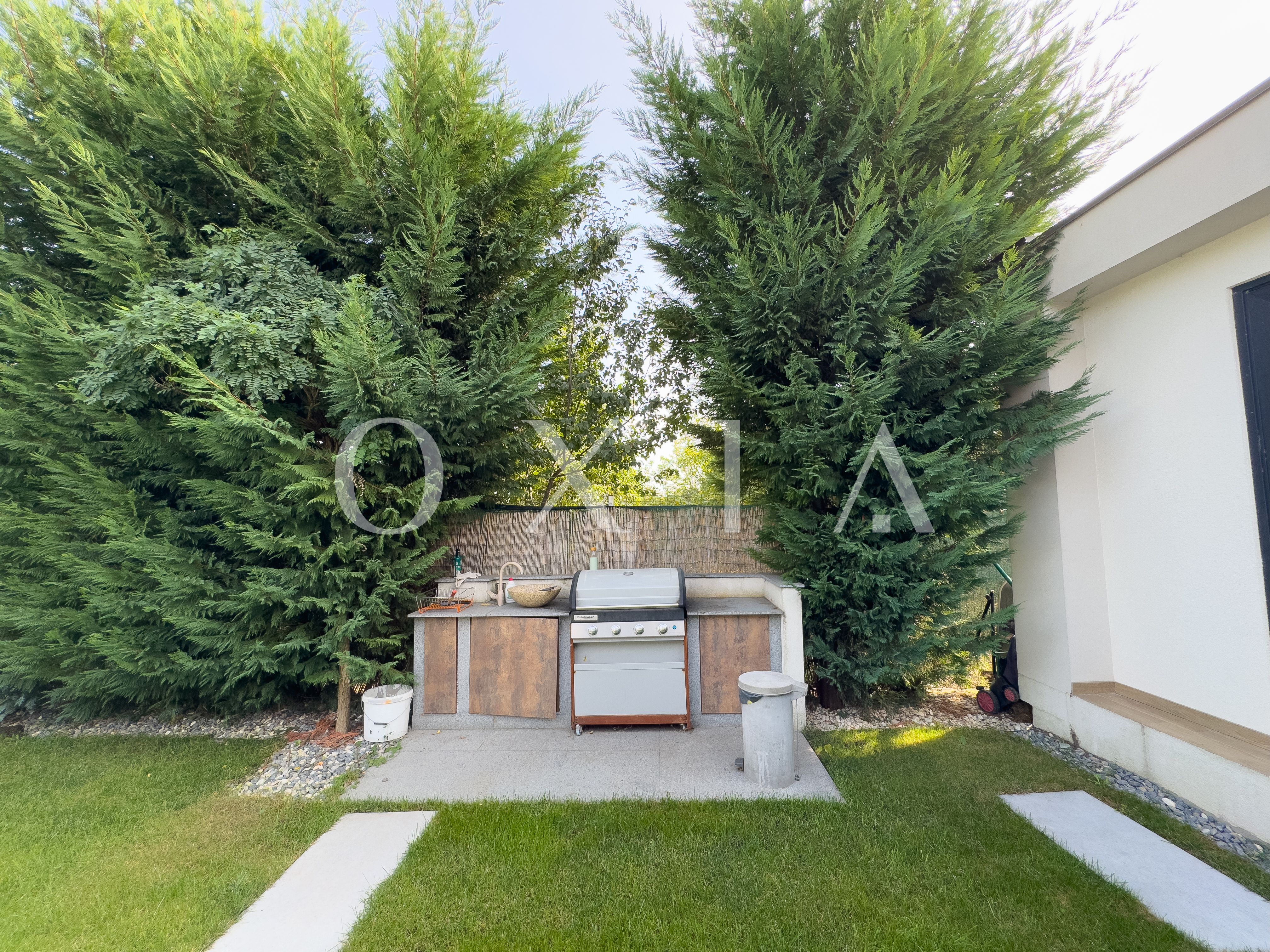 In exterior, gasim o terasa acoperita, loc pentru gratar, vegetatie pentru intimitate, carport si un drum de acces privat. De asemenea, in spatele casei exista o anexa de 45 MP formata dintr-o camera, bucatarie si baie, potrivita pentru locuit sau diverse activitati.
