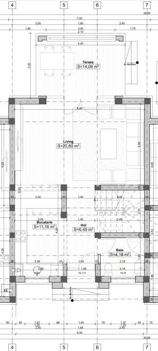 Parter: hol acces, living, bucatarie, baie, debara sub scara, terasa acoperita.