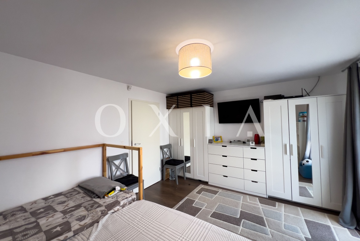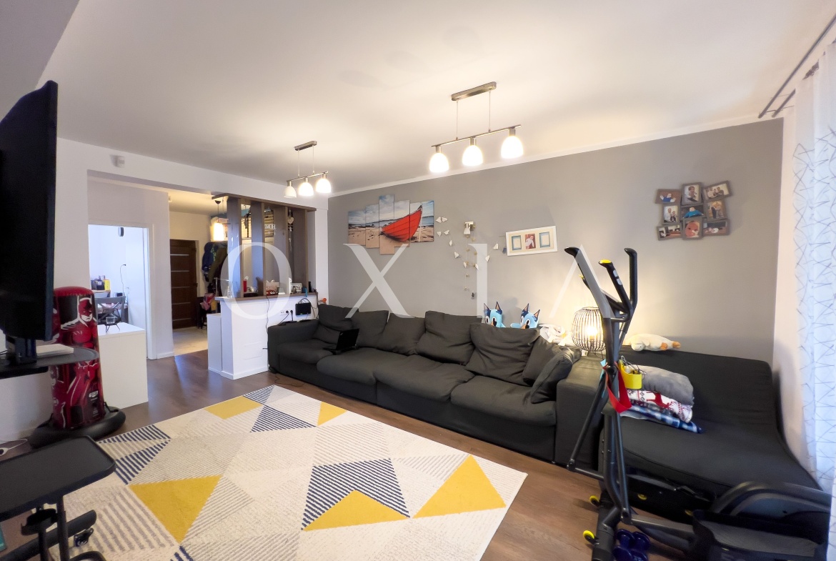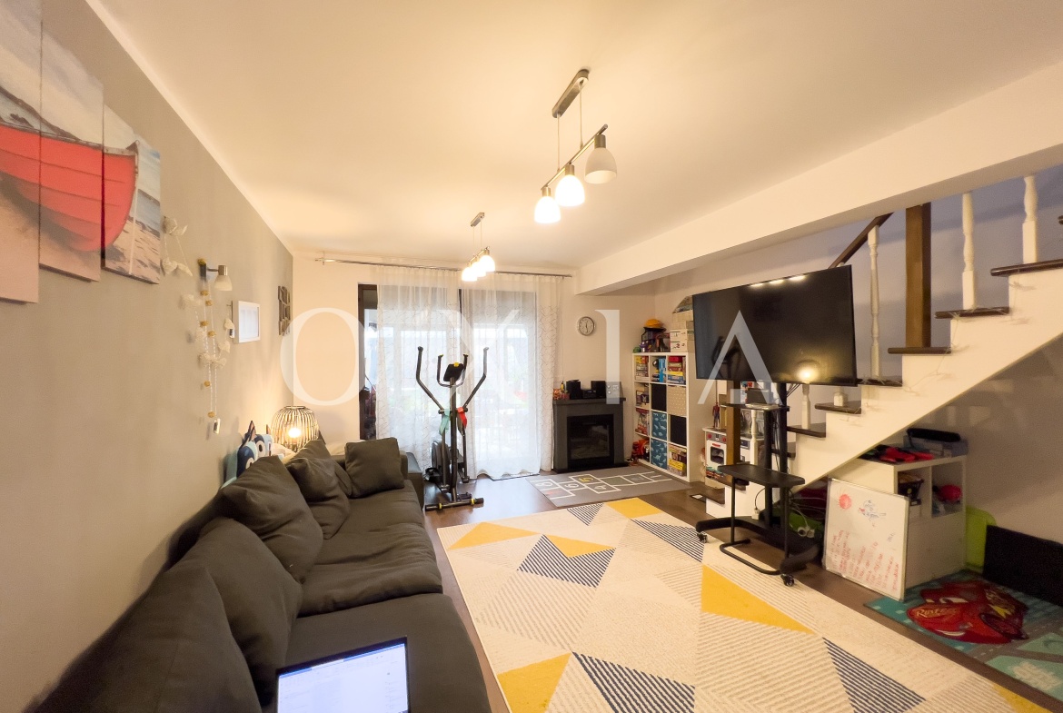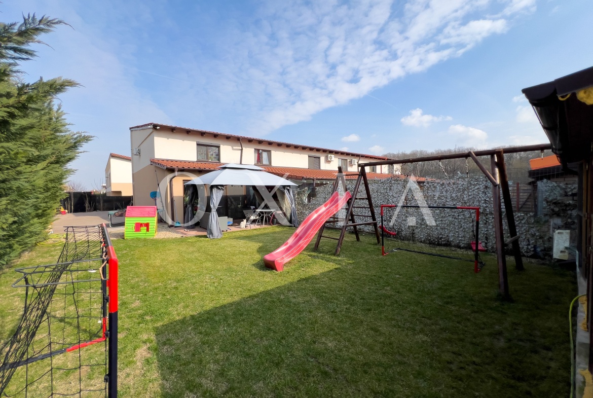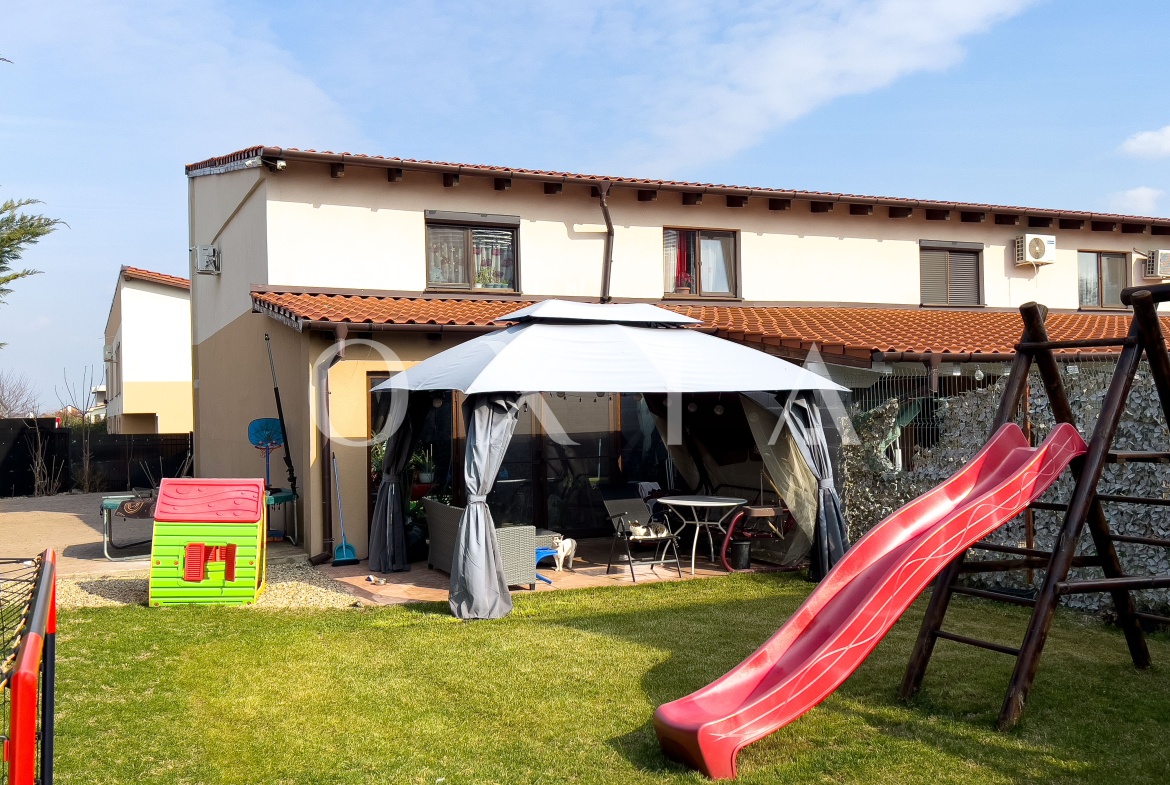 OXIA prezinta spre vanzare casa P+E situata in ansamblu rezidential (capat), in Dumbravita, langa Padure, cu suprafata terenului de 333 mp, suprafata utila de 85 MP + 15 MP terasa inchisa, compartimentata astfel: