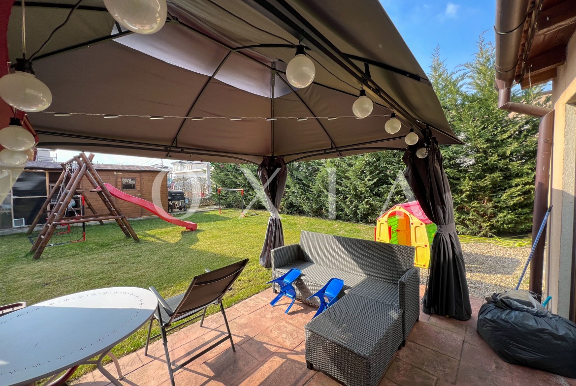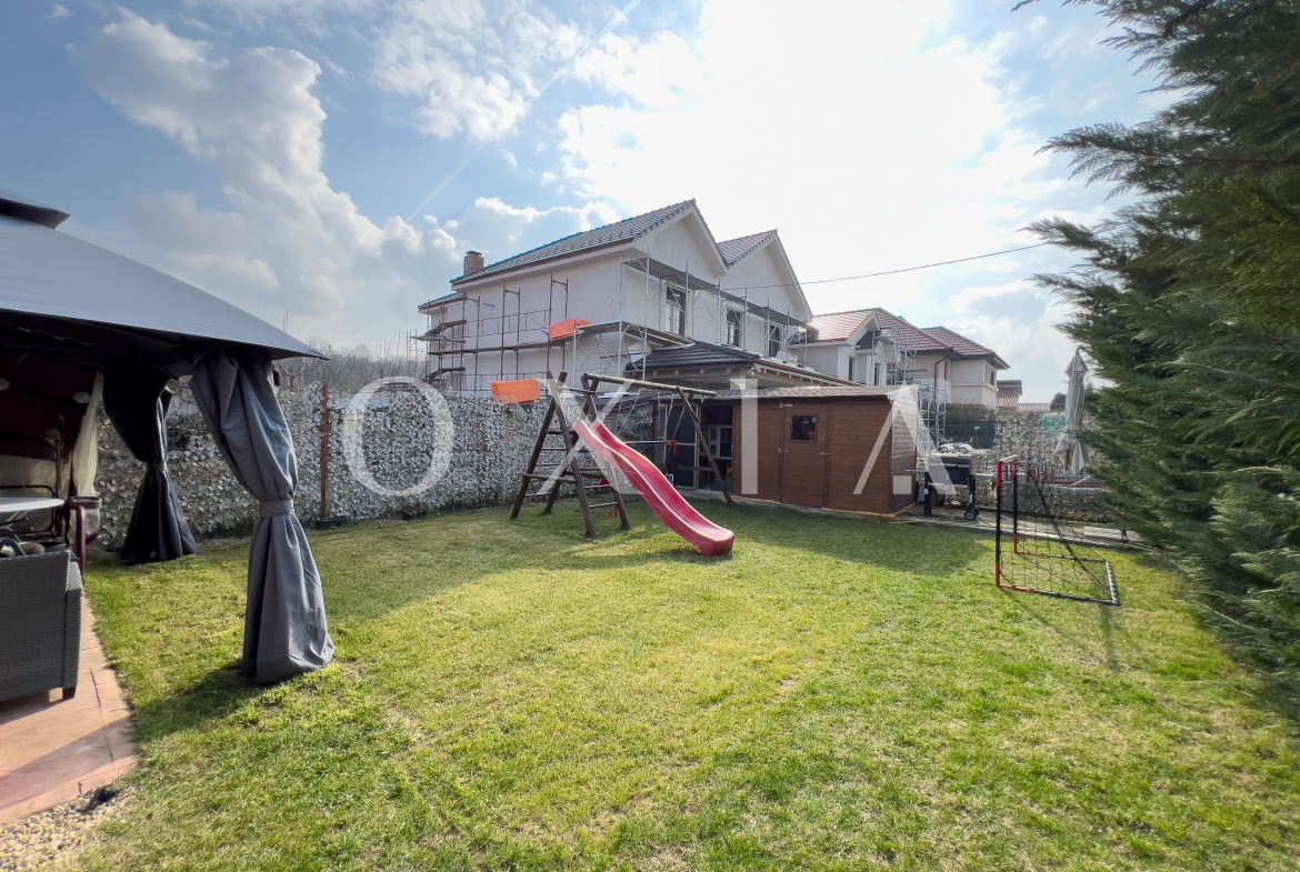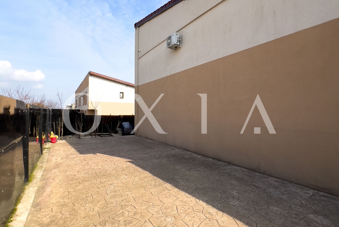 Spatiul exterior este amenajat, beneficiaza de o magazie pentru depozitare, poarta automatizata, sistem de irigatie cu pompa, sistem de alarma, sistem de supraveghere video.