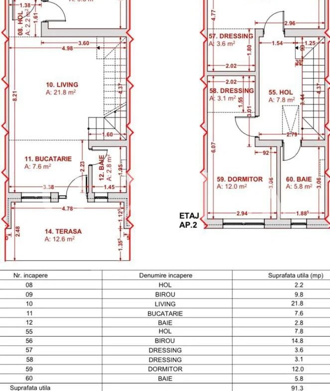 Etaj: hol foarte lat, 2 dormitoare fiecare cu dresing propriu, baie.