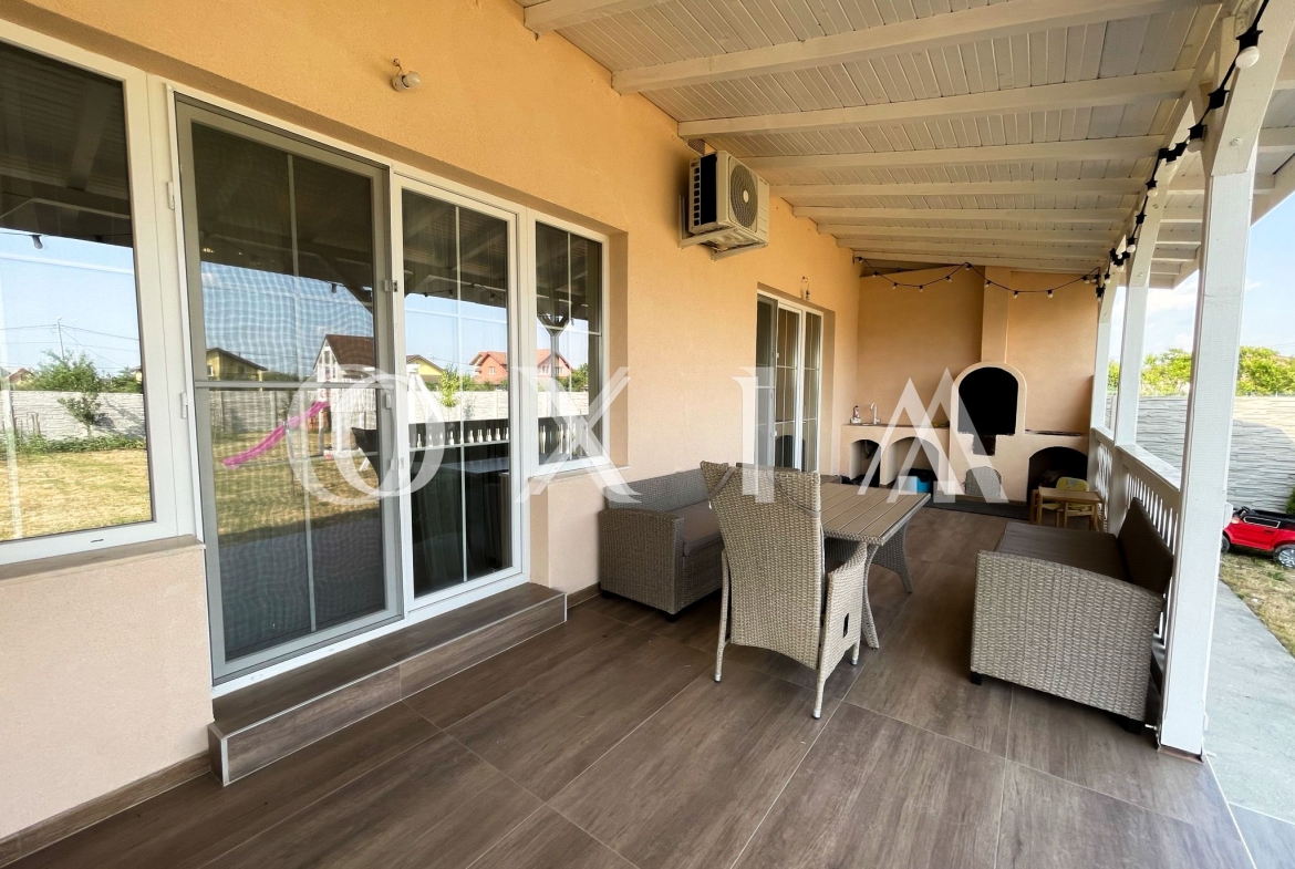 – hol acces, living cu bucatarie open space si dining, dormitor matrimonial cu dresing si baie, 2 dormitoare, 1 baie, terasa acoperita cu loc pentru gratar.