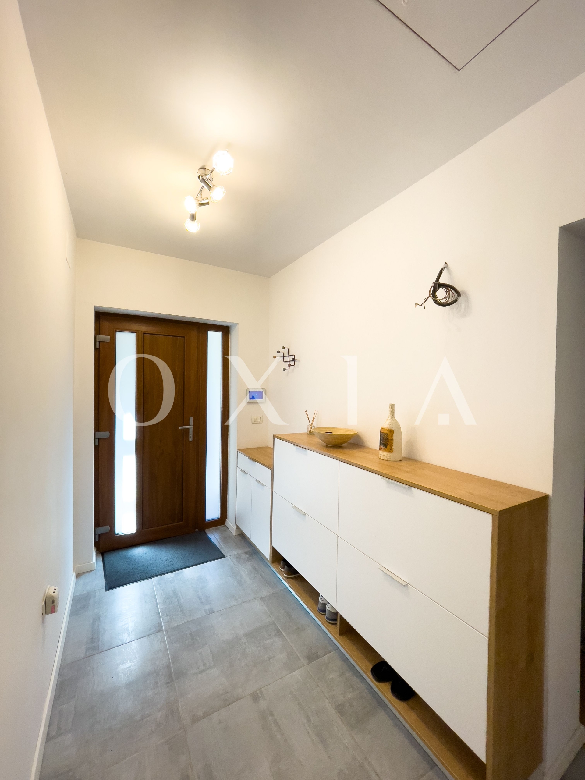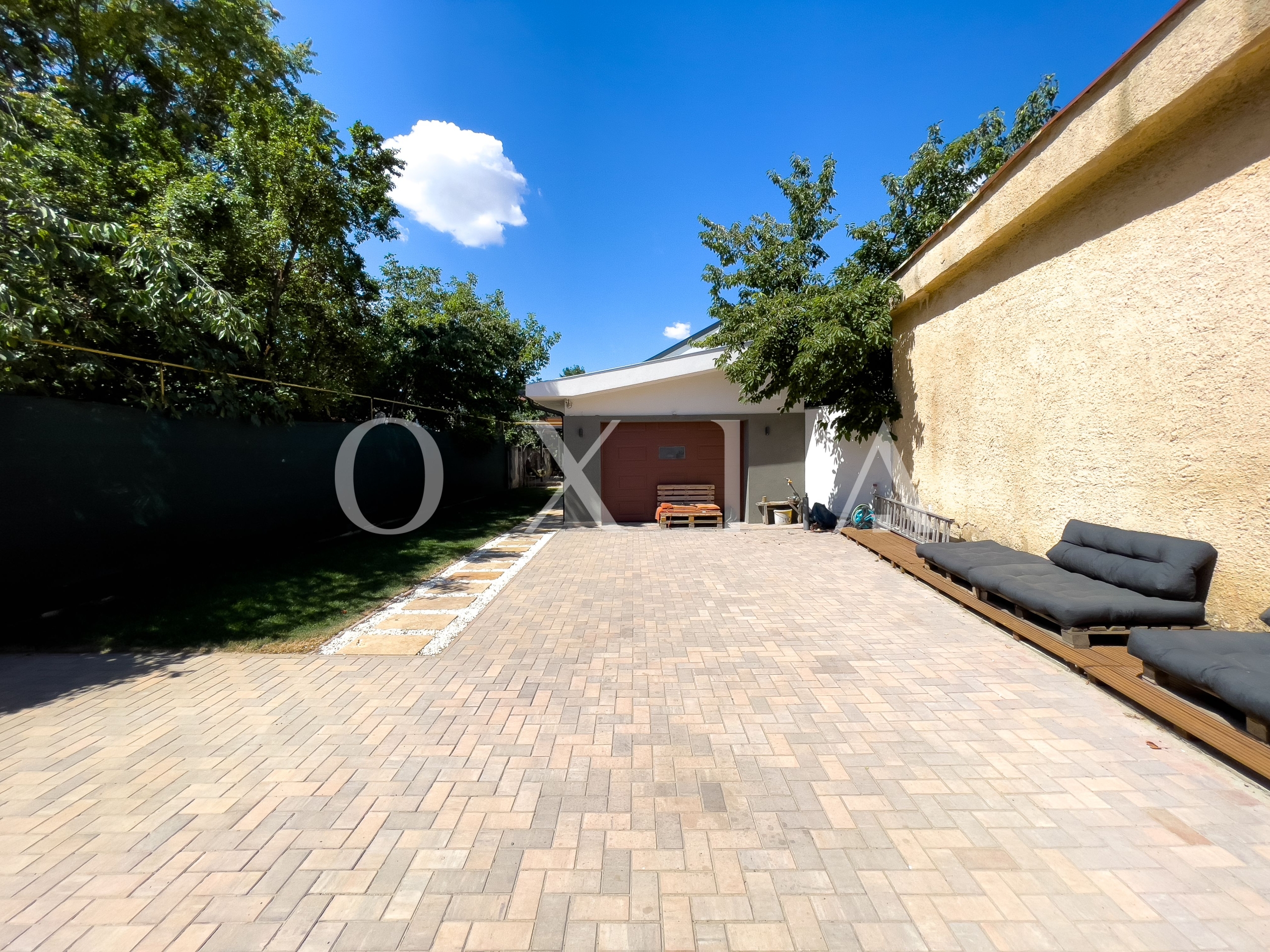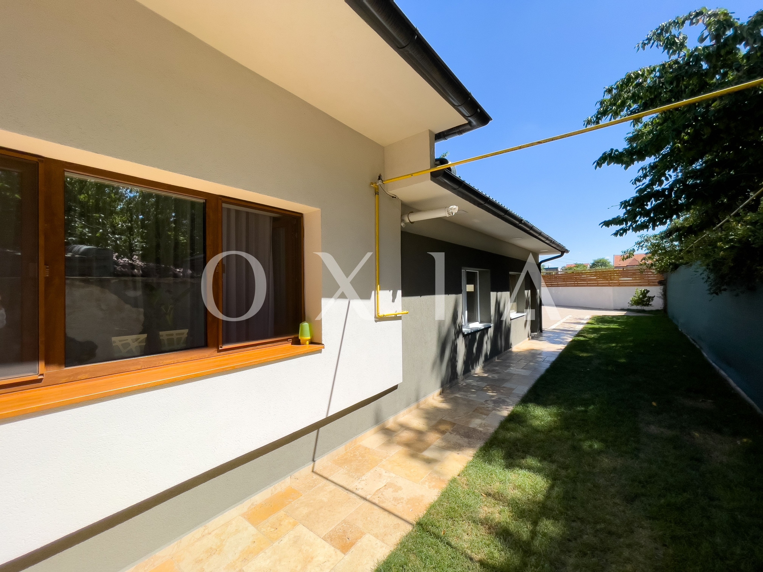 Accesul pietonal in curte se face cu ajutorul videointefonului care are optiunea de a deschide de la distanta de pe telefon, poarta de acces auto si de la garaj fiind automatizate cu telecomanda. Curtea are suprafata de aproximativ 100 mp, este amenajata cu gazon, pavaj pentru masini, alei placate cu travertin, iluminat arhitectural, supraveghere video.