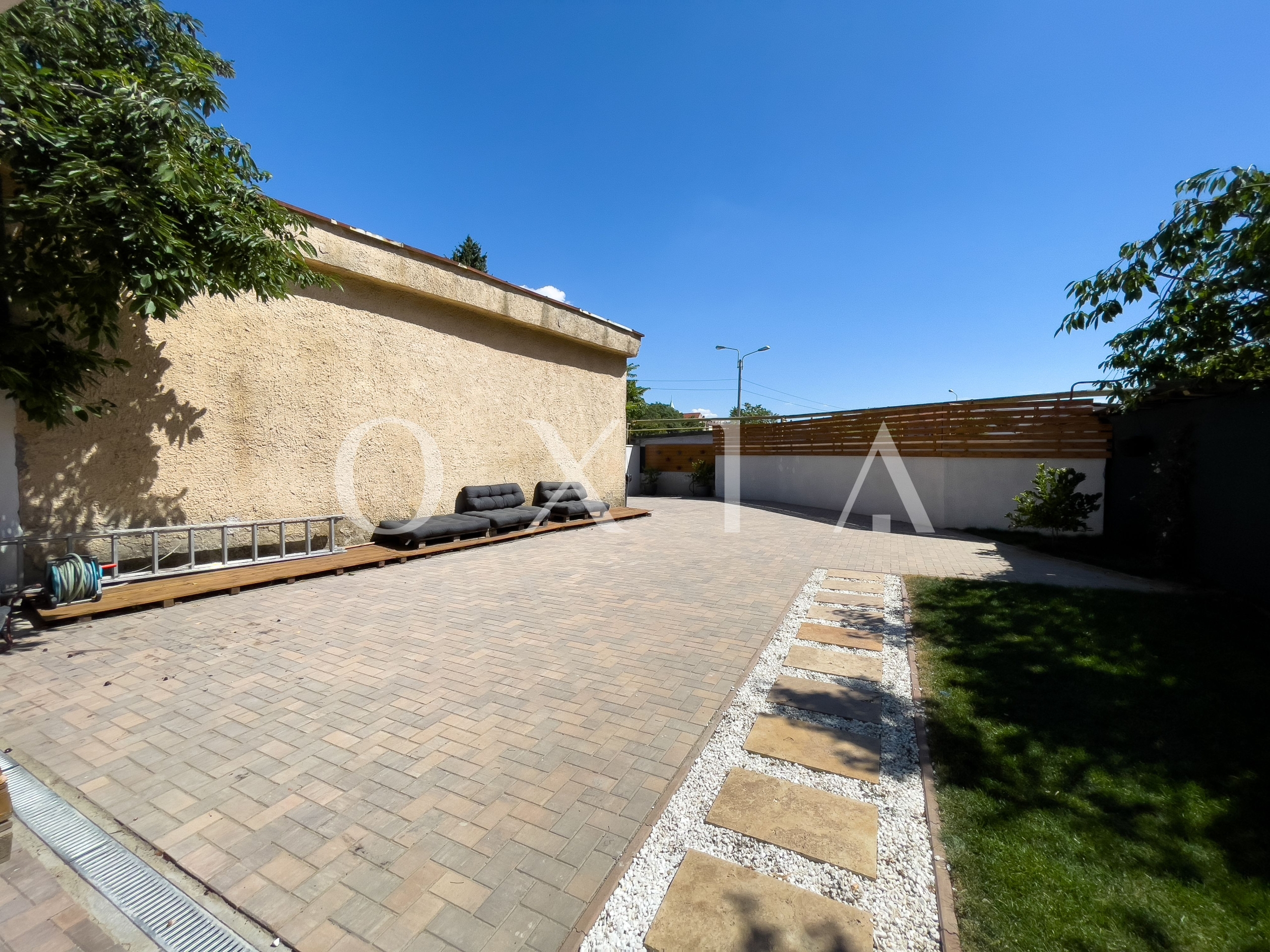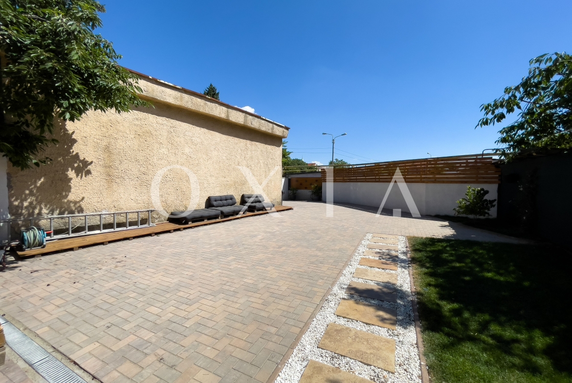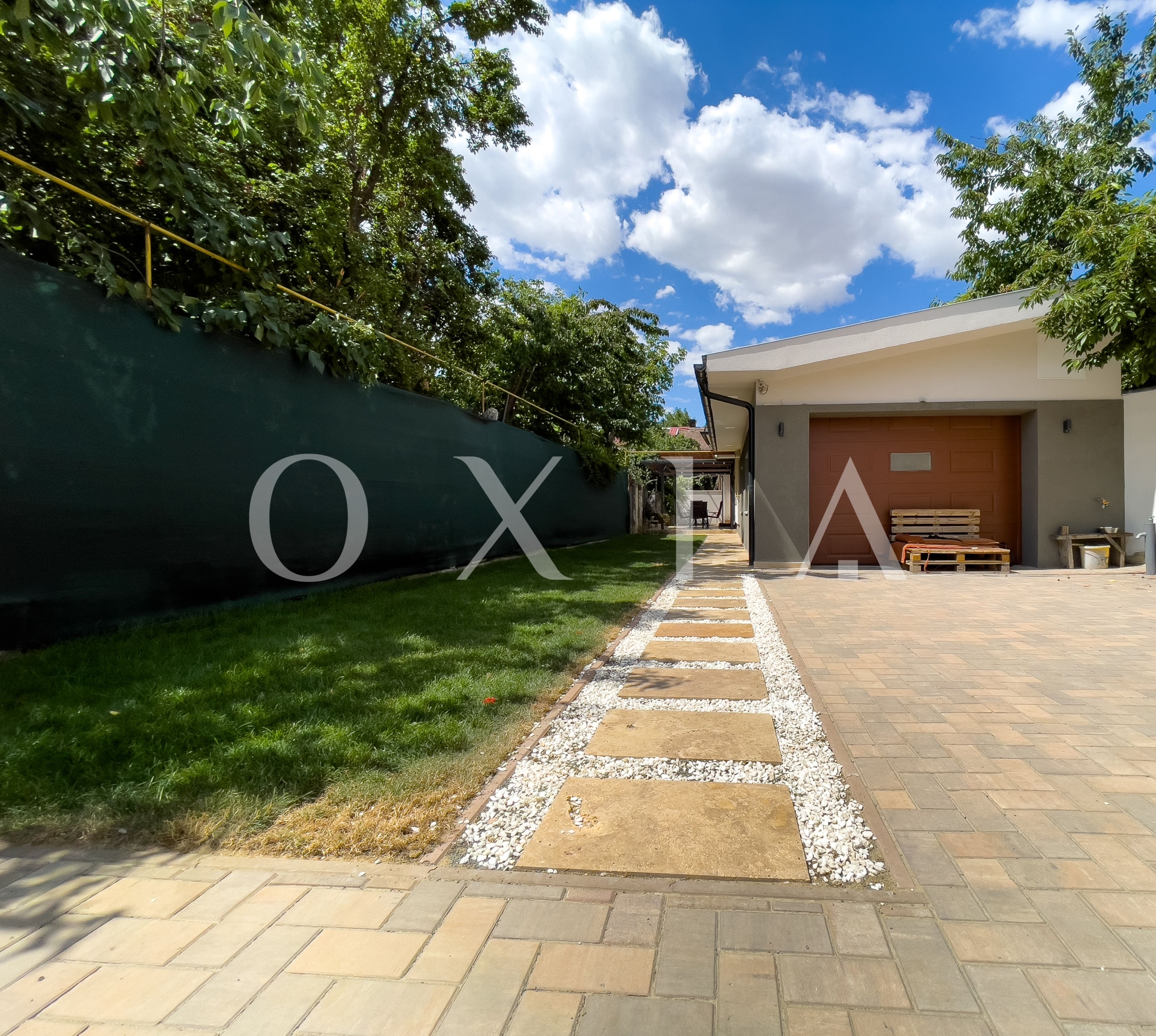 Accesul pietonal in curte se face cu ajutorul videointefonului care are optiunea de a deschide de la distanta de pe telefon, poarta de acces auto si de la garaj fiind automatizate cu telecomanda. Curtea are suprafata de aproximativ 100 mp, este amenajata cu gazon, pavaj pentru masini, alei placate cu travertin, iluminat arhitectural, supraveghere video.