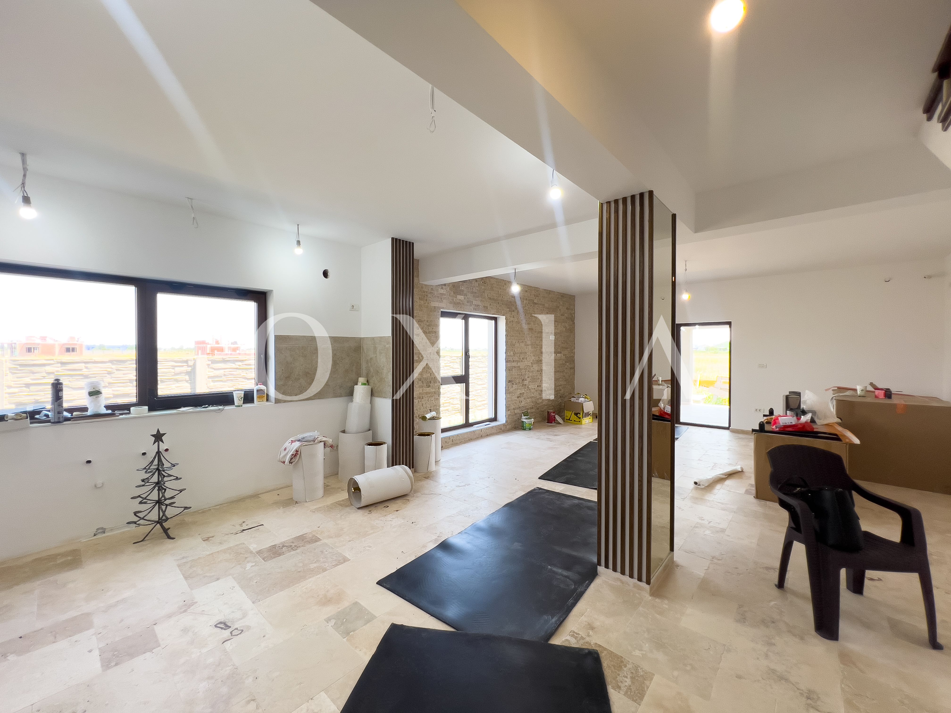 Proprietatea beneficiaza de amenajari moderne: ferestre PVC cu geam tripan Rehau, usi interioare PortaDoors, travertin, trepte din lemn masiv (stejar), pereti placati cu piatra decorativa, vopsea lavabila, parchet laminat, gresie si faianta. Confort termic asigurat de centrala proprie cu incalzire in pardoseala. Casa este pregatita pentru sisteme de climatizare (doua unitati).