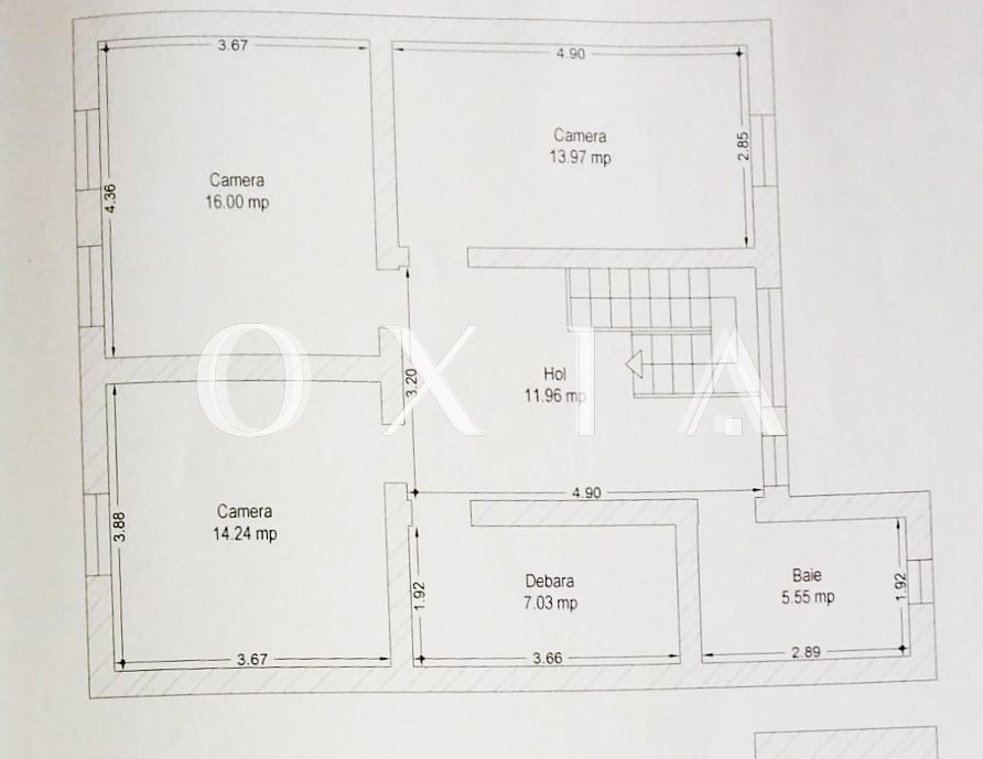 Mansarda: hol, 3 dormitoare, dressing/birou, baie.