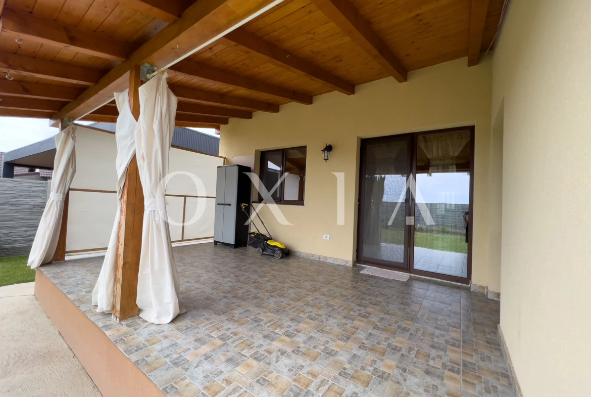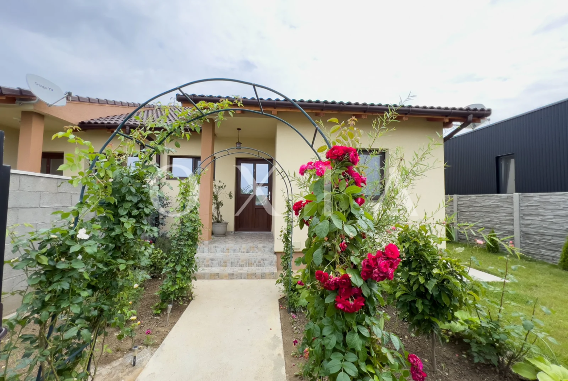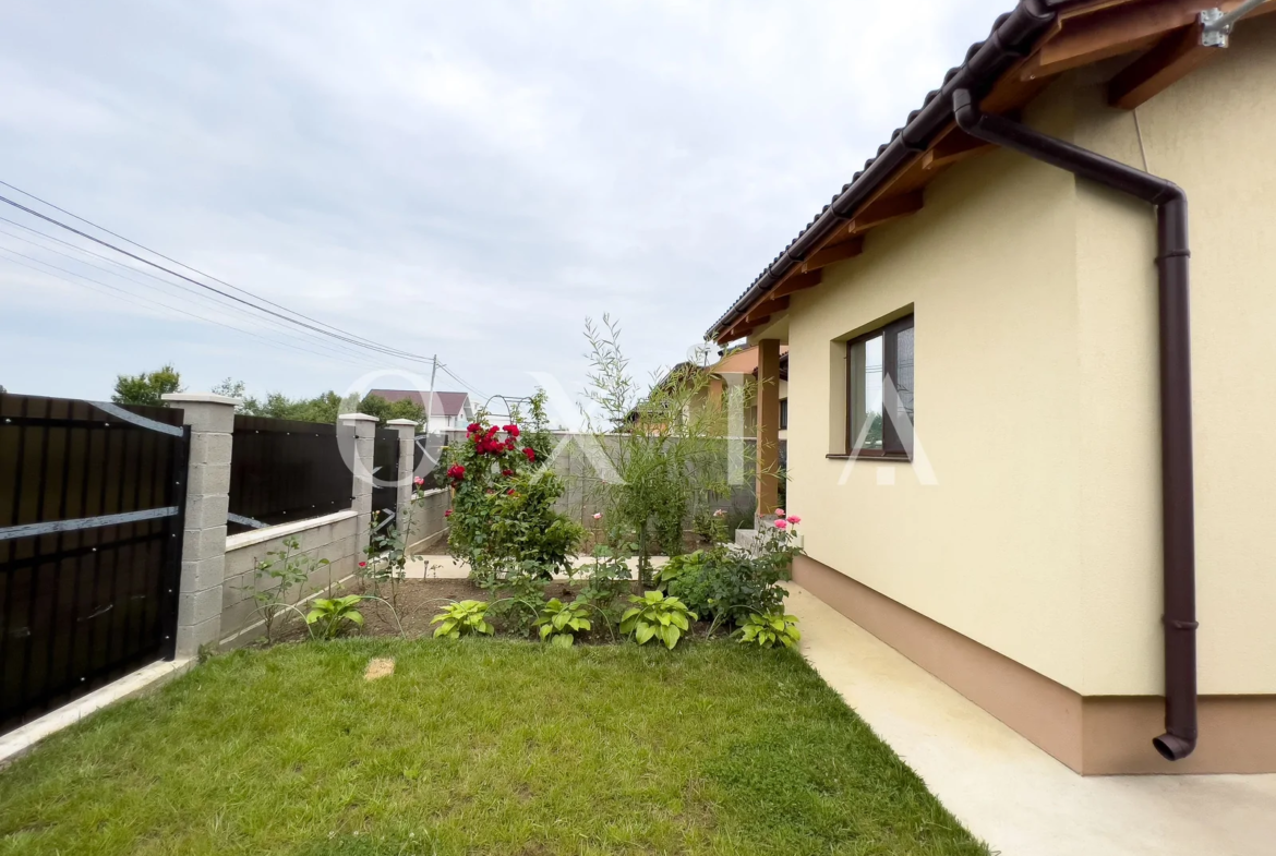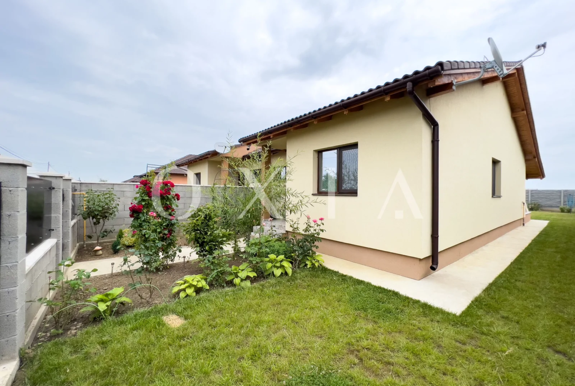 Casa este construita din caramida, izolata cu polistiren de 10 cm, acoperita cu tigla si dispune de amenajari moderne: ferestre PVC cu geam tripan, placi de gresie/faianta, instalatie electrica de cupru, parchet laminat, vopsea lavabila, usi interior celulare, curte amenajata cu gazon si sistem de supraveghere video.