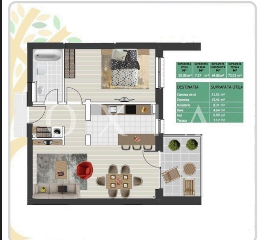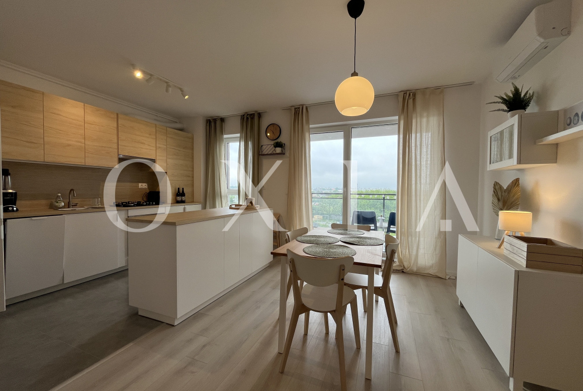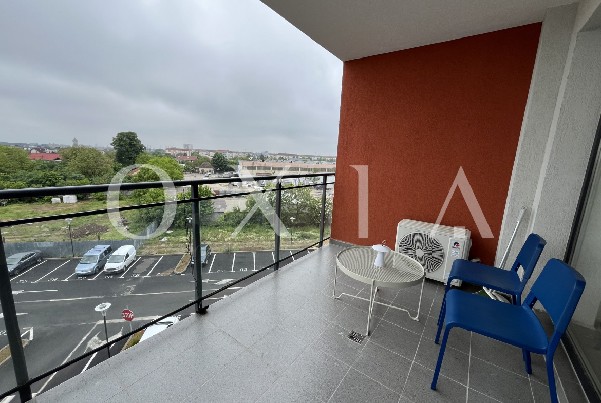 OXIA prezinta spre inchiriere apartament cu 2 camere, situat in Timisoara, in Complexul Rezidential Denya Forest, etajul 3 in bloc cu regim de inaltime P+11, imobil dotat cu lift, apartament semidecomandat, cu suprafata de 56MP utili + 7MP balcon, compartimentat astfel: