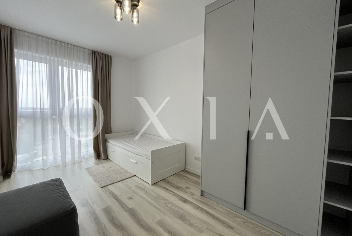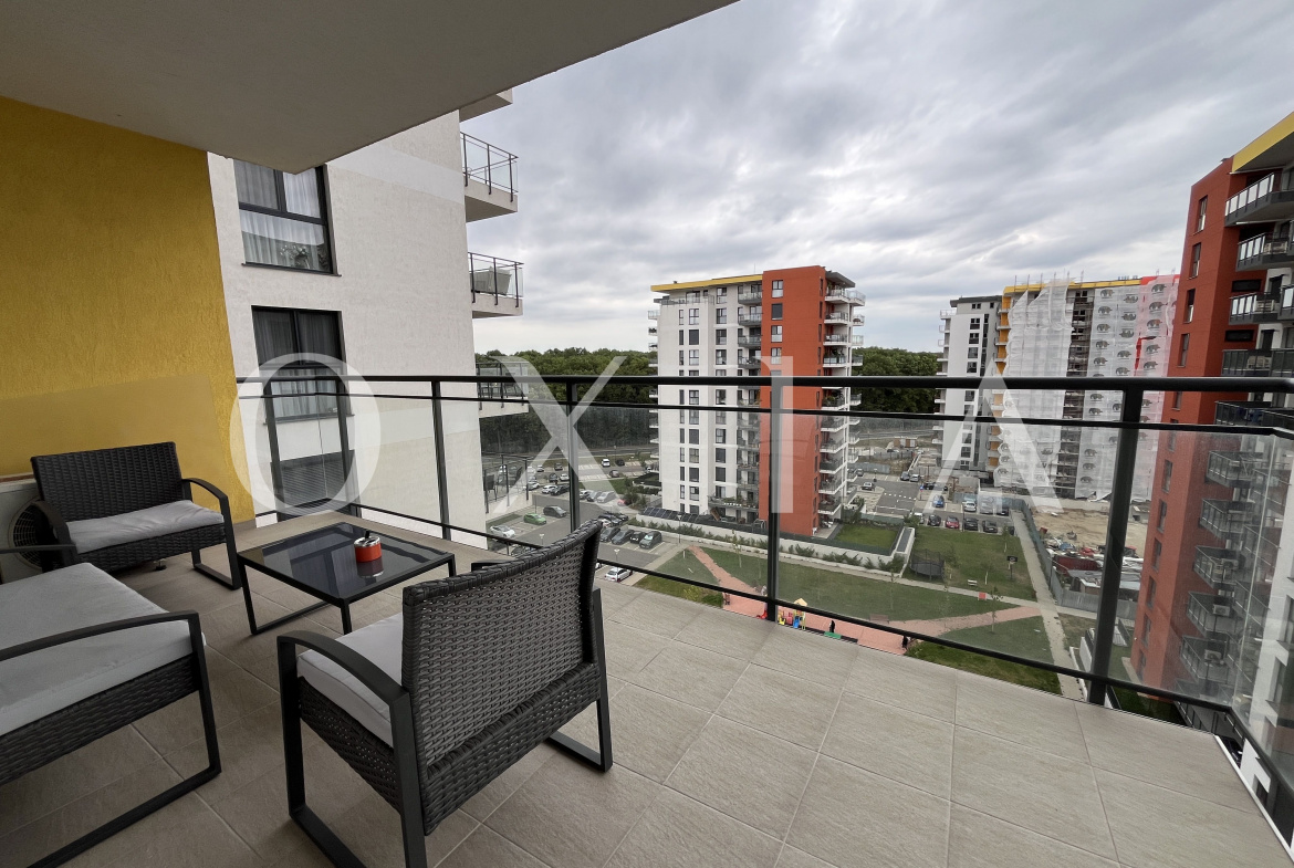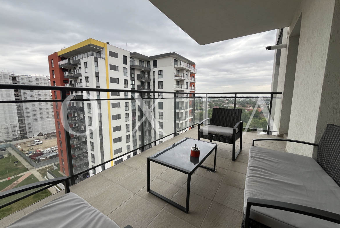 OXIA prezinta spre inchiriere apartament cu 3 camere, situat in Timisoara, in Complexul Rezidential Denya Forest, etajul 9 in bloc cu regim de inaltime P+11, imobil dotat cu lift, apartament semidecomandat, cu suprafata de 67MP utili + 10 MP terasa, compartimentat astfel: