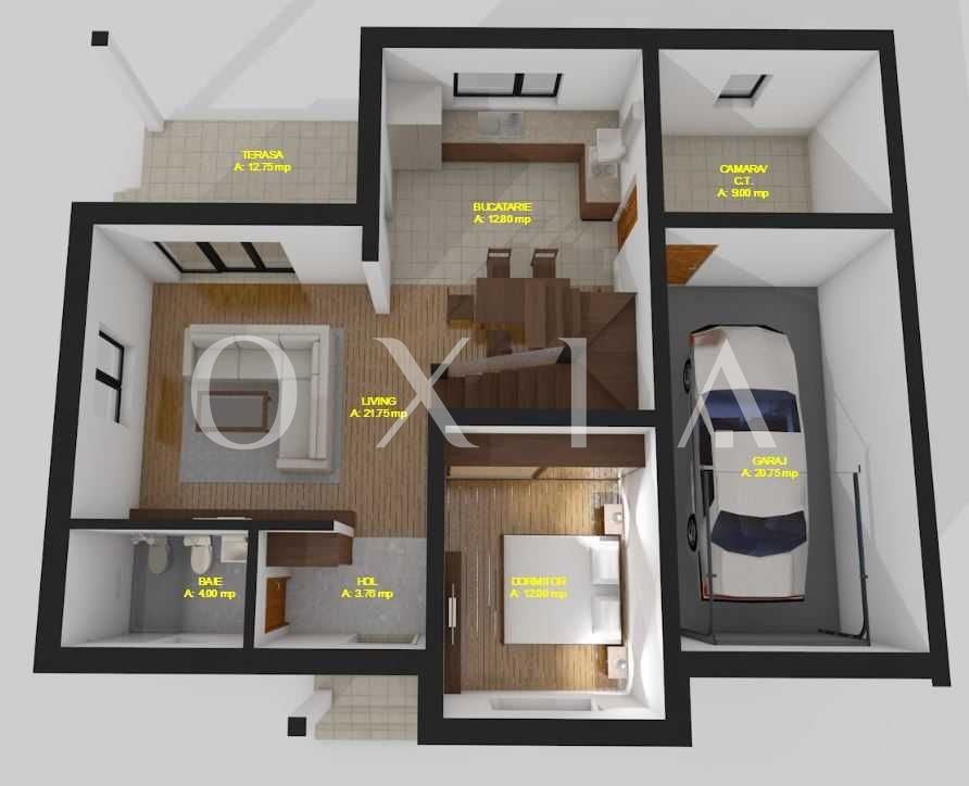 Parter: hol acces, living cu bucatarie open space, 1 dormitor, 1 baie, 1 debara, terasa.