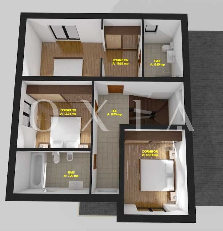 Etaj: hol, dormitor matrimonial(20mp) cu baie porprie, 2 dormitoare, 1 baie.