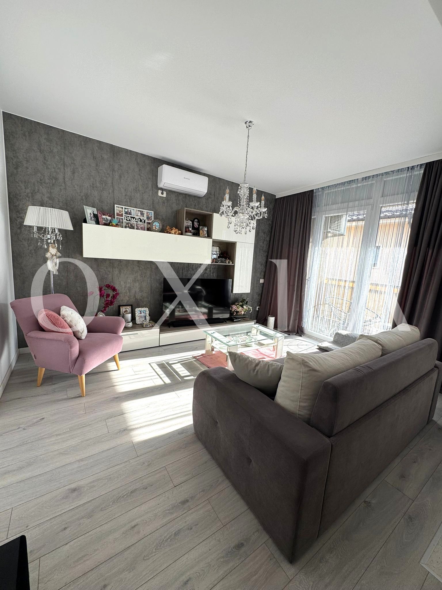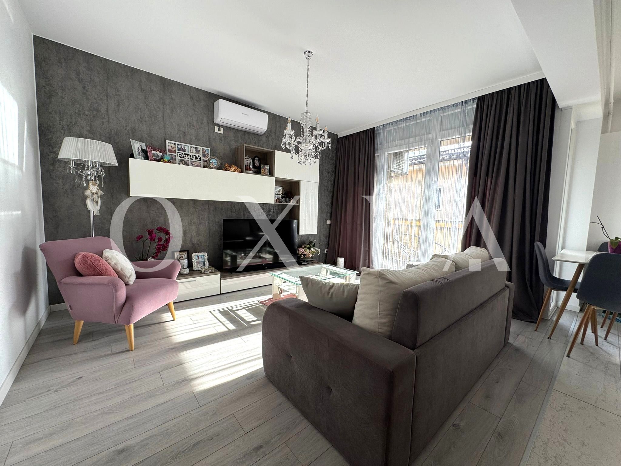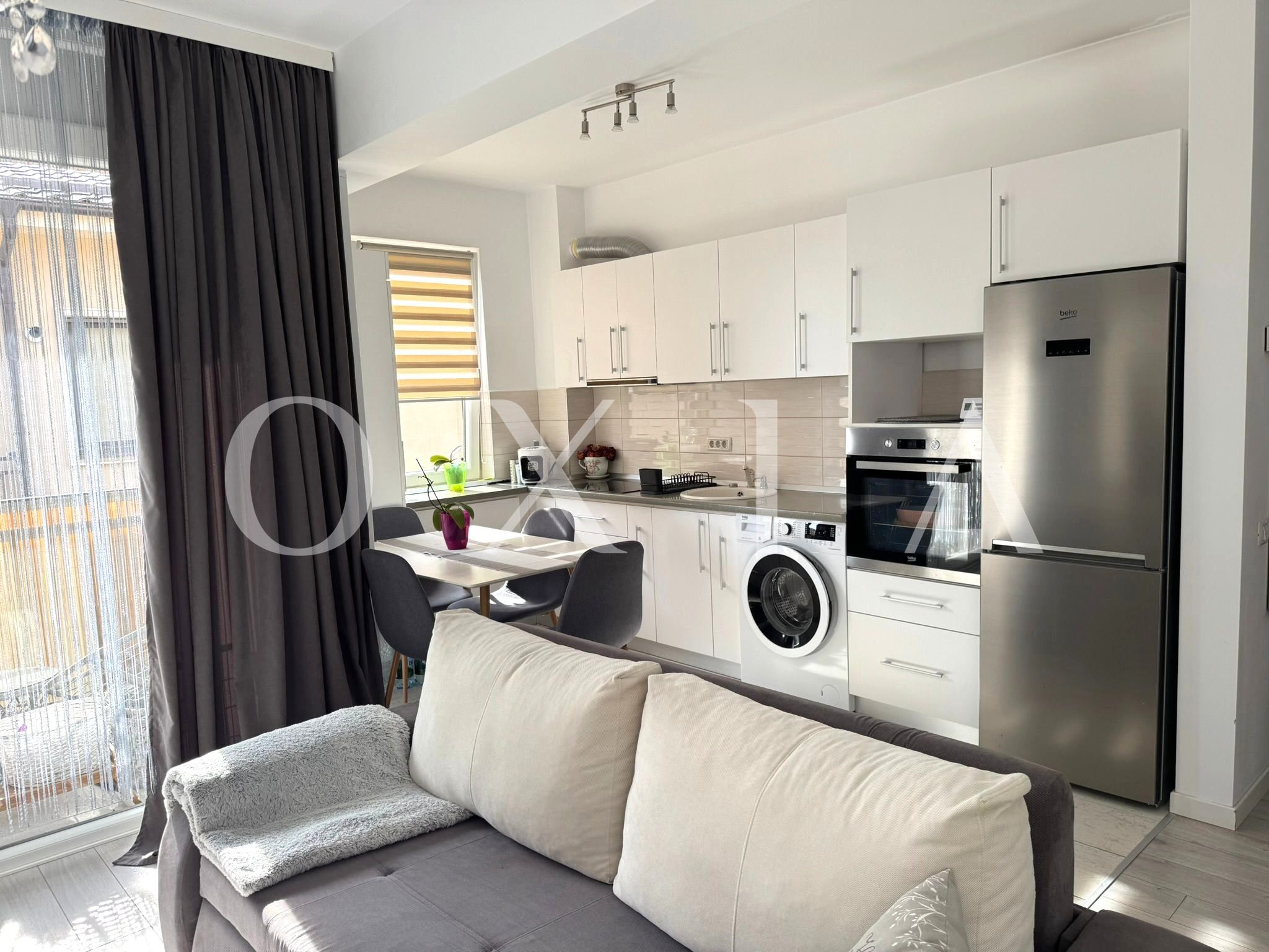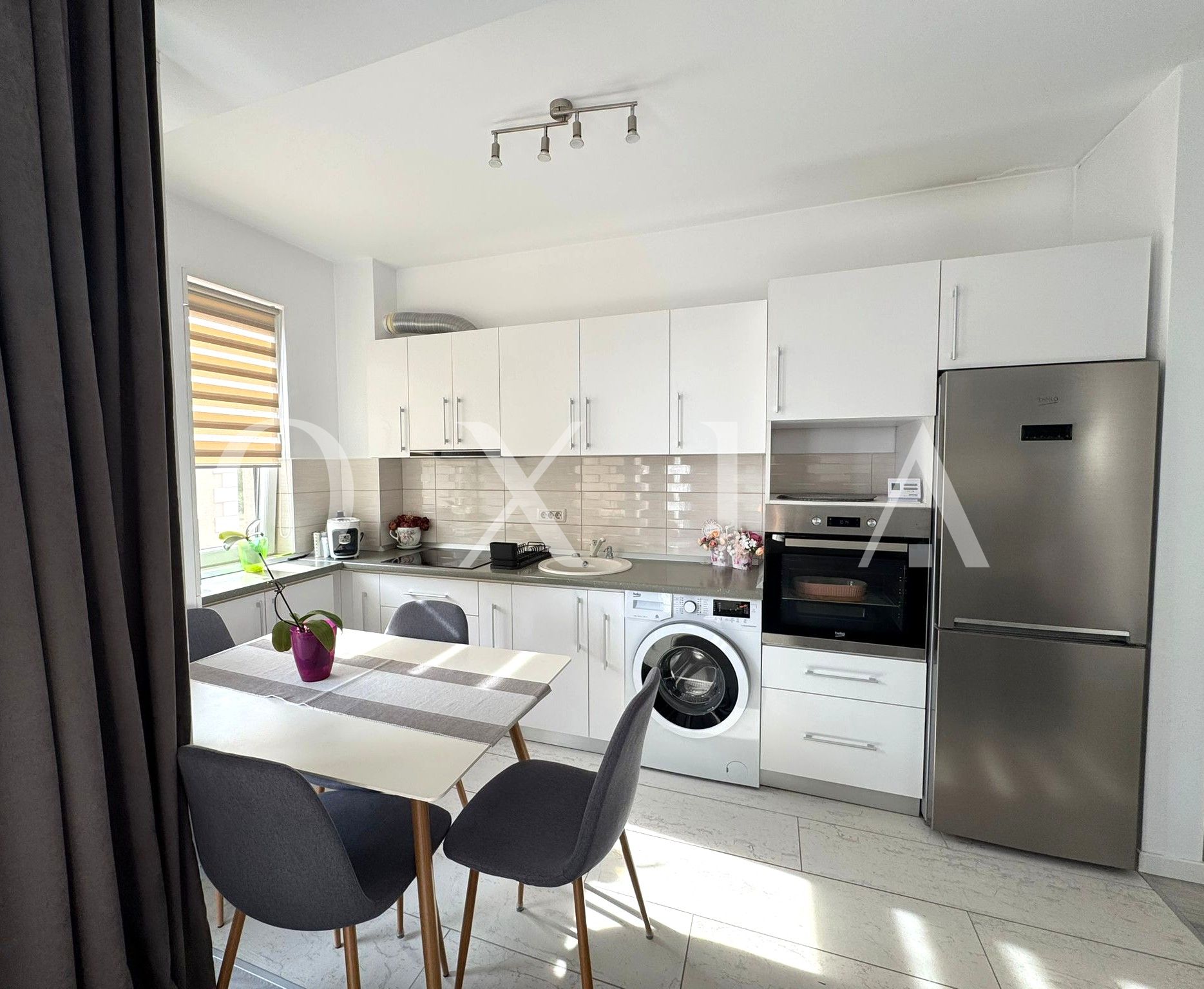 OXIA The Real Estate Agency prezinta spre vanzare apartament cu 2 camere, situat in Dumbravita, zona Decathlon, la etajul 2/2 + Pod, imobil din 2019, semidecomandat, cu suprafata de 48 mp utili + balcon de 10 mp, compartimentat astfel: