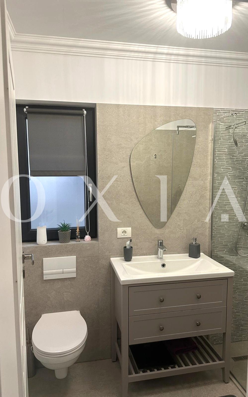 – o baie cu cabina de dus si geam de aerisire