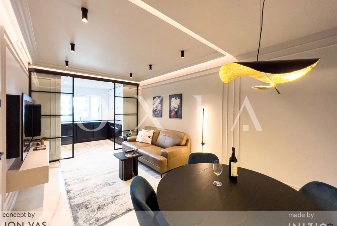 Apartamentul este nou si beneficiaza de amenajari premium: usa intrare metalica antiefractie, usi filomuro (toc ascus, balamale ascunse) , vopsite in culoarea peretilor, usile dintre bucatarie si living sunt din sticla securizata, cu inchidere soft close, placi de gresie/faianta mari (Tempini), vopsea lavabila Brillux, prize si intrerupatoare premium in configuratie personalizata, iluminat cu becuri led, termostat ambiental in fiecare incapere, jaluzele electrice, mobila de bucatarie este din MDF vopsit cu balamale blum, baterie de chiuveta cu retragere in blat, sertare metalice, electrocasnice premium (Bosch, Teka), TV-uri Samsung The Frame, canapea din piele naturala, dus incastrat in perete, spatii generoase de depozitare, etc.