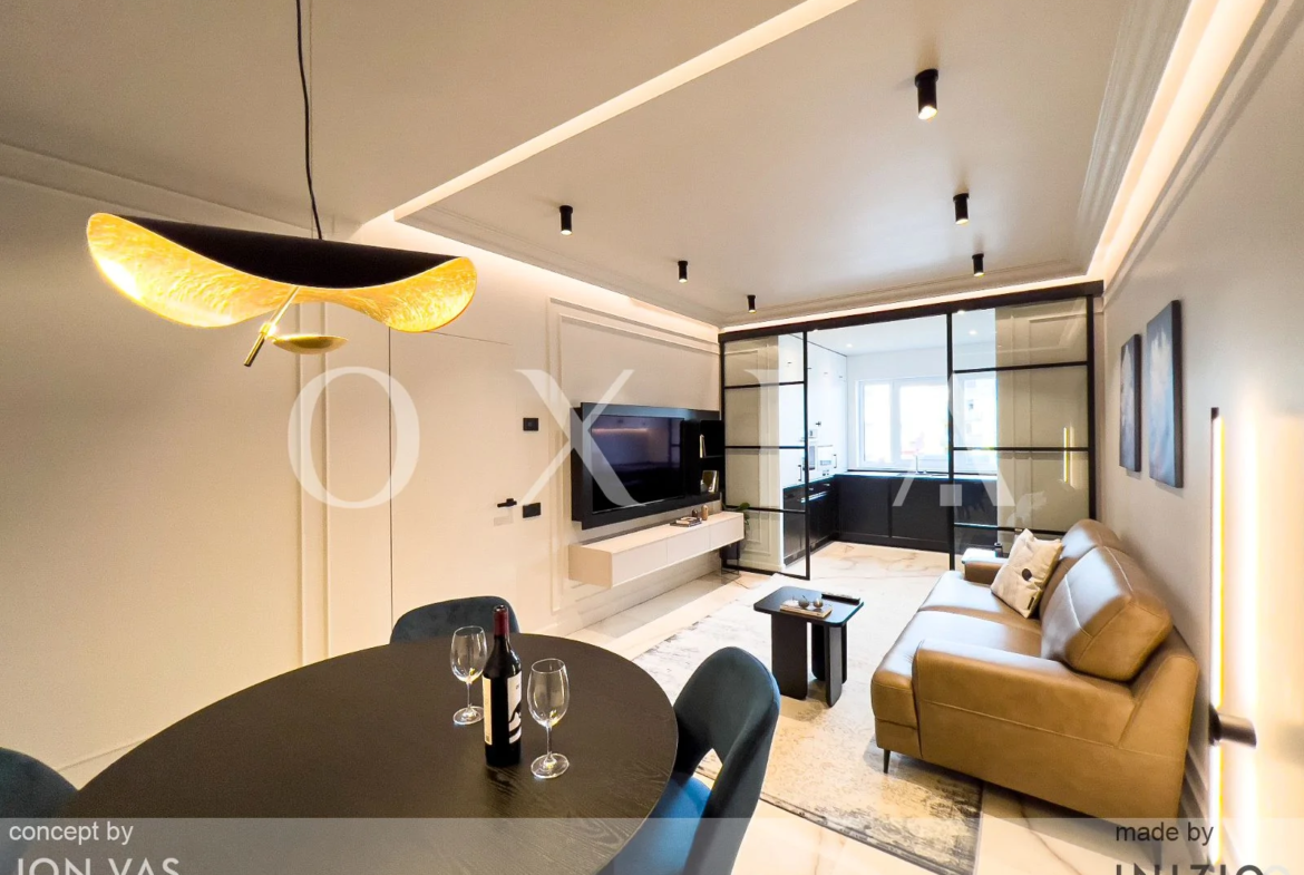 Apartamentul este nou si beneficiaza de amenajari premium: usa intrare metalica antiefractie, usi filomuro (toc ascus, balamale ascunse) , vopsite in culoarea peretilor, usile dintre bucatarie si living sunt din sticla securizata, cu inchidere soft close, placi de gresie/faianta mari (Tempini), vopsea lavabila Brillux, prize si intrerupatoare premium in configuratie personalizata, iluminat cu becuri led, termostat ambiental in fiecare incapere, jaluzele electrice, mobila de bucatarie este din MDF vopsit cu balamale blum, baterie de chiuveta cu retragere in blat, sertare metalice, electrocasnice premium (Bosch, Teka), TV-uri Samsung The Frame, canapea din piele naturala, dus incastrat in perete, spatii generoase de depozitare, etc.