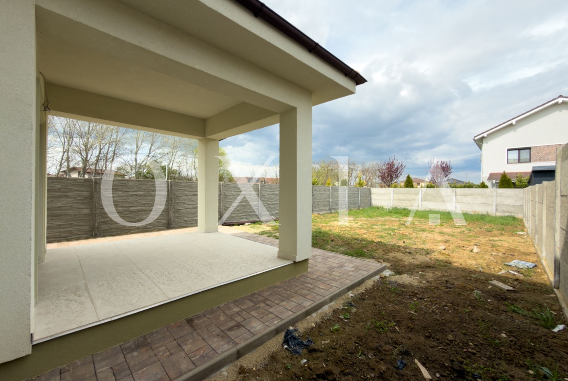 Imobilul este realizat din caramida Porotherm, cu izolatie exterioara din polistiren, acoperis din tigla si imprejmuire cu gard din beton si porti metalice, completate de pavaj si alei pietonale amenajate.