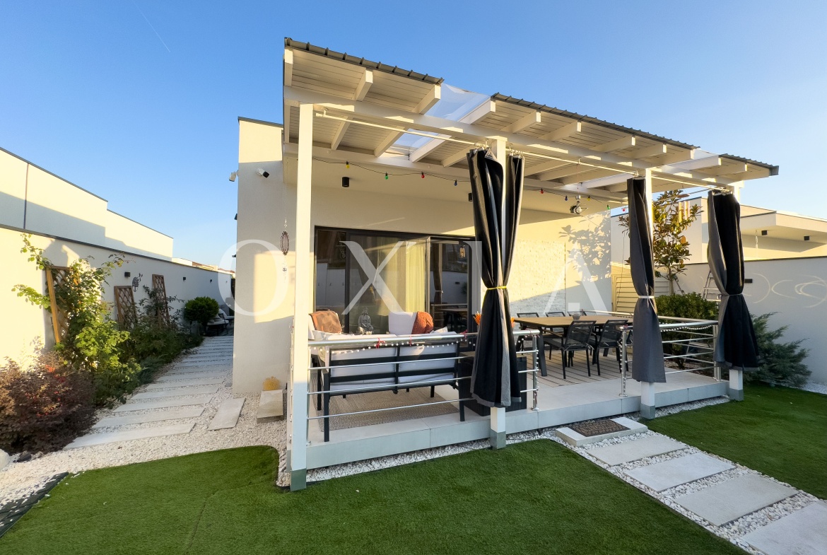 Spatiul exterior este amenajat cu un jacuzzi de top, cu doua motoare, incalzire, jeturi si bule, iluminat si acoperit – perfect pentru relaxare. Gradina este decorata cu plante ornamentale, pomi iluminati si include o casuta de depozitare. In plus, proprietatea dispune de prize exterioare si o priza pentru incarcarea masinilor electrice (32 amperi).