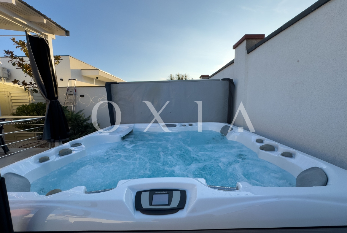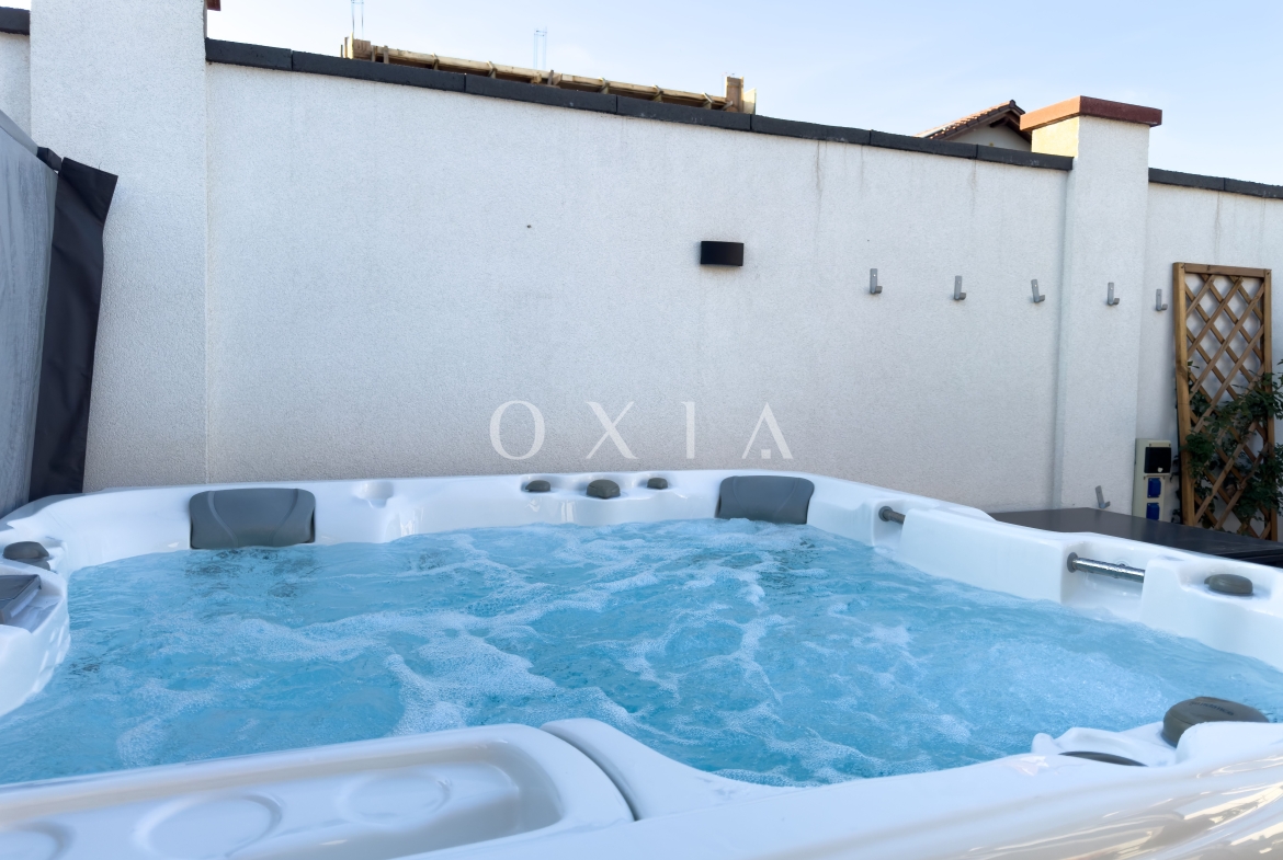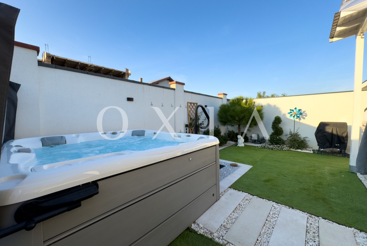 Spatiul exterior este amenajat cu un jacuzzi de top, cu doua motoare, incalzire, jeturi si bule, iluminat si acoperit – perfect pentru relaxare. Gradina este decorata cu plante ornamentale, pomi iluminati si include o casuta de depozitare. In plus, proprietatea dispune de prize exterioare si o priza pentru incarcarea masinilor electrice (32 amperi).