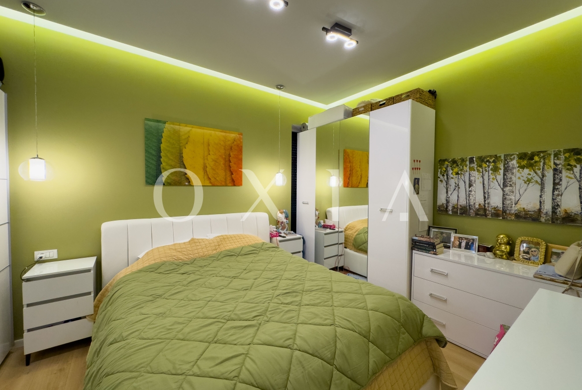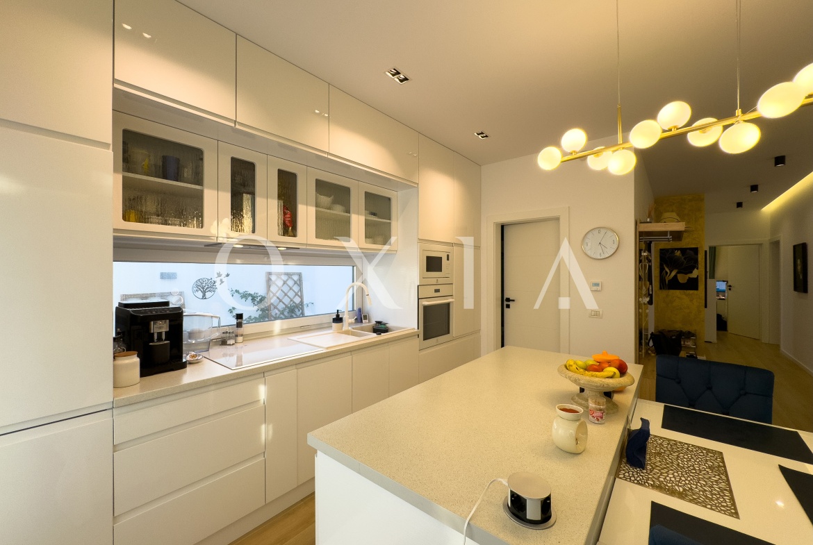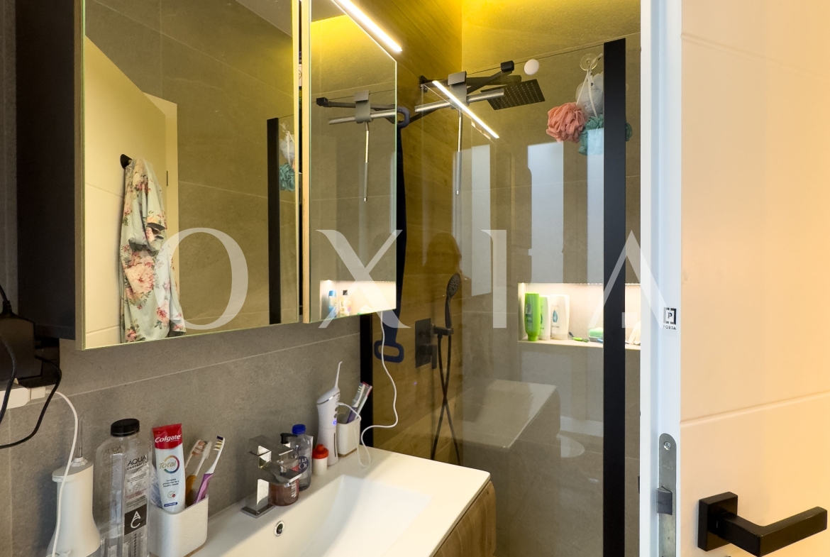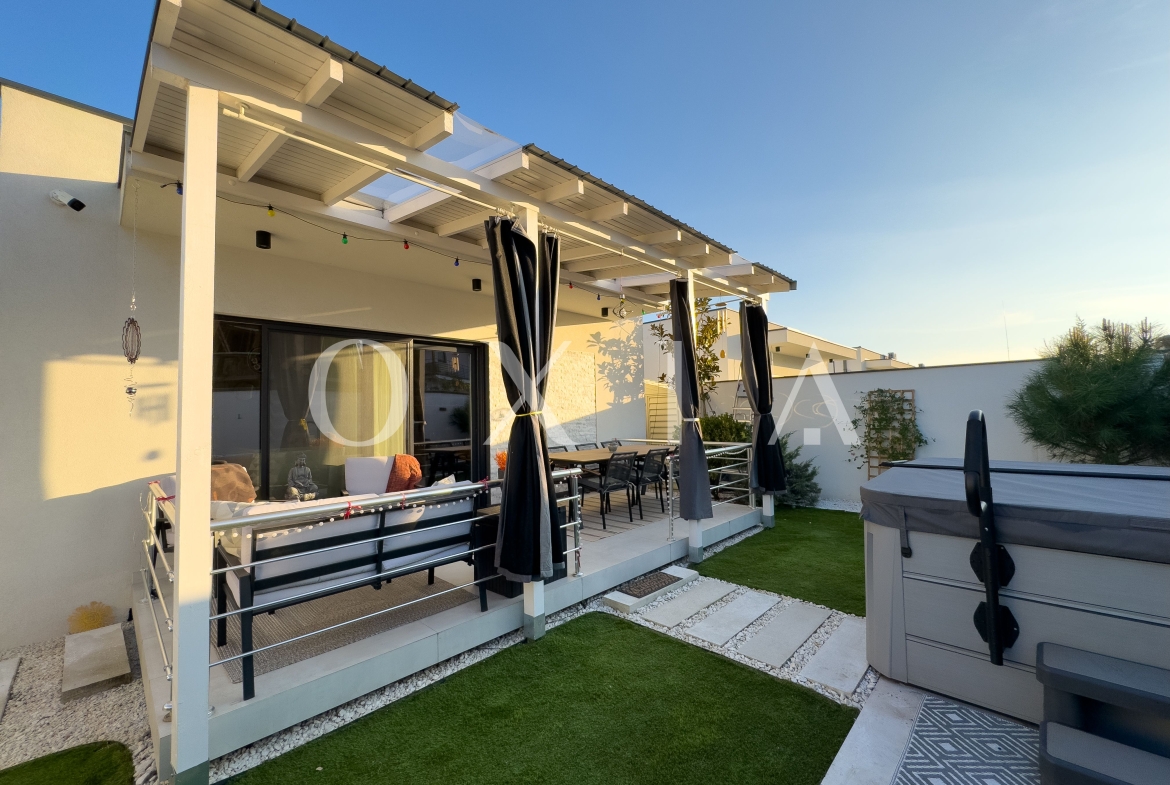 Spatiul exterior este amenajat cu un jacuzzi de top, cu doua motoare, incalzire, jeturi si bule, iluminat si acoperit – perfect pentru relaxare. Gradina este decorata cu plante ornamentale, pomi iluminati si include o casuta de depozitare. In plus, proprietatea dispune de prize exterioare si o priza pentru incarcarea masinilor electrice (32 amperi).