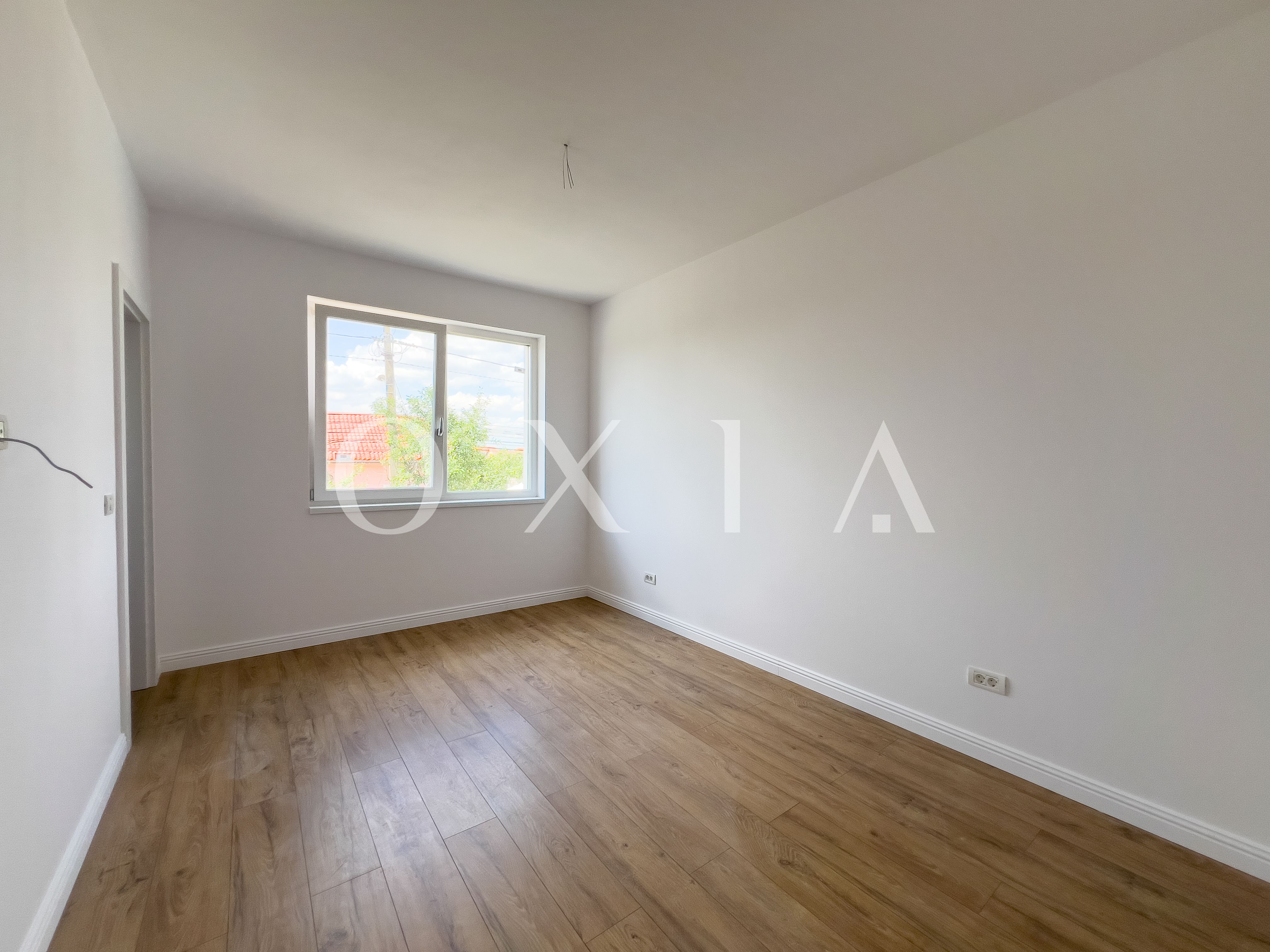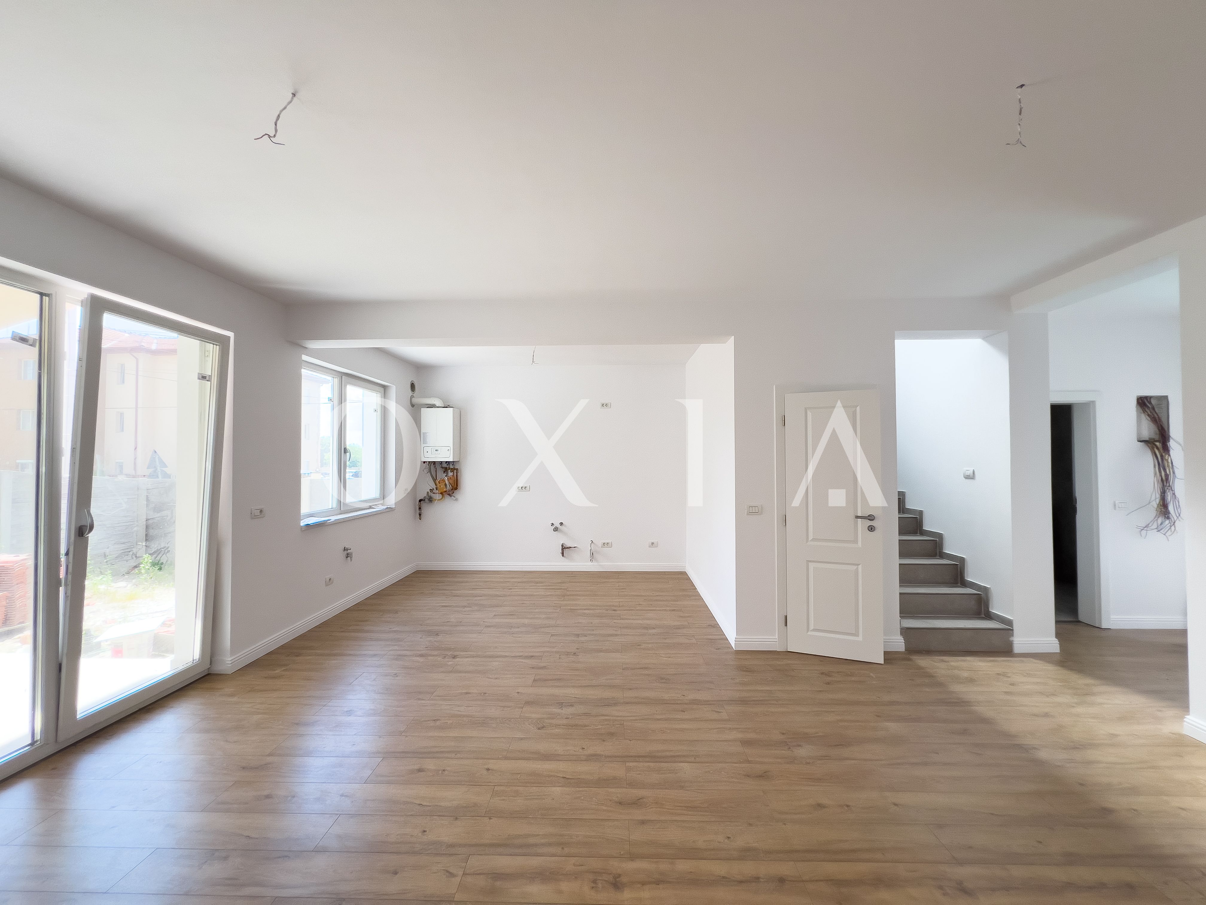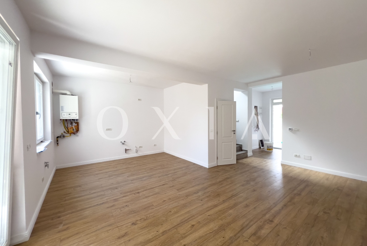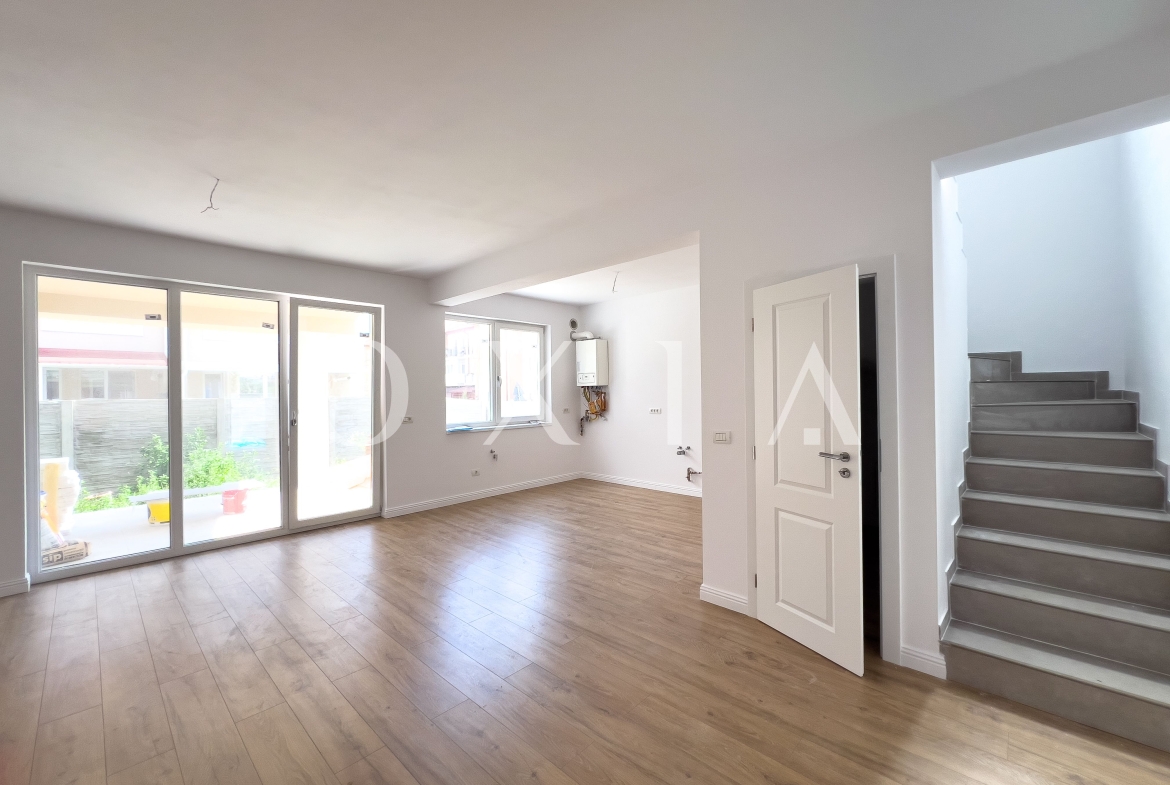 OXIA prezinta spre vanzare unitate in Duplex situat in Giroc, vatra satului, la asfalt, cu suprafata terenului de 200 mp, suprafata construita de 160 mp (amprenta casei la sol este de aproximativ 90 mp), suprafata utila de 120 mp + 17 mp terasa acoperita, compartimentata astfel: