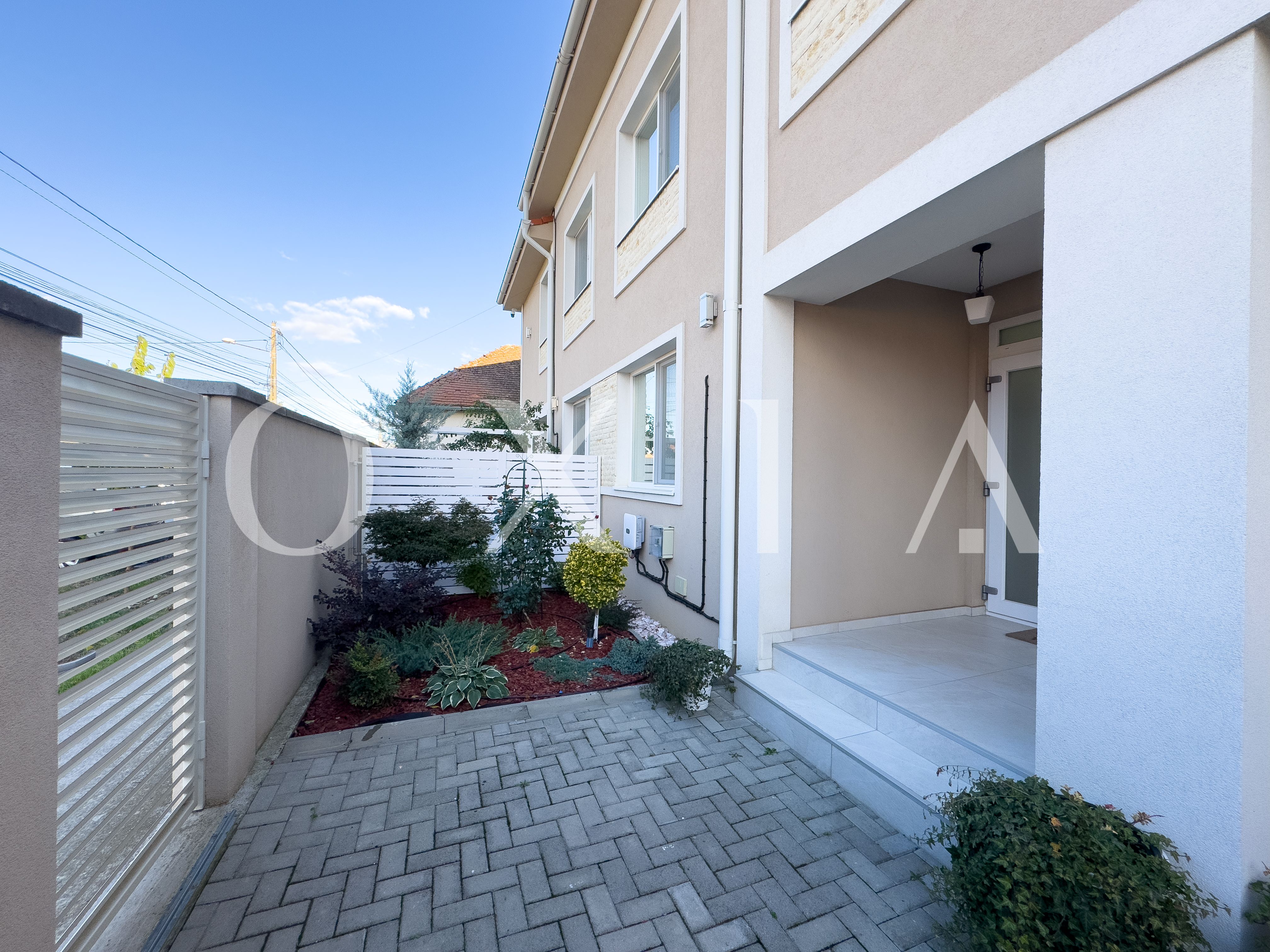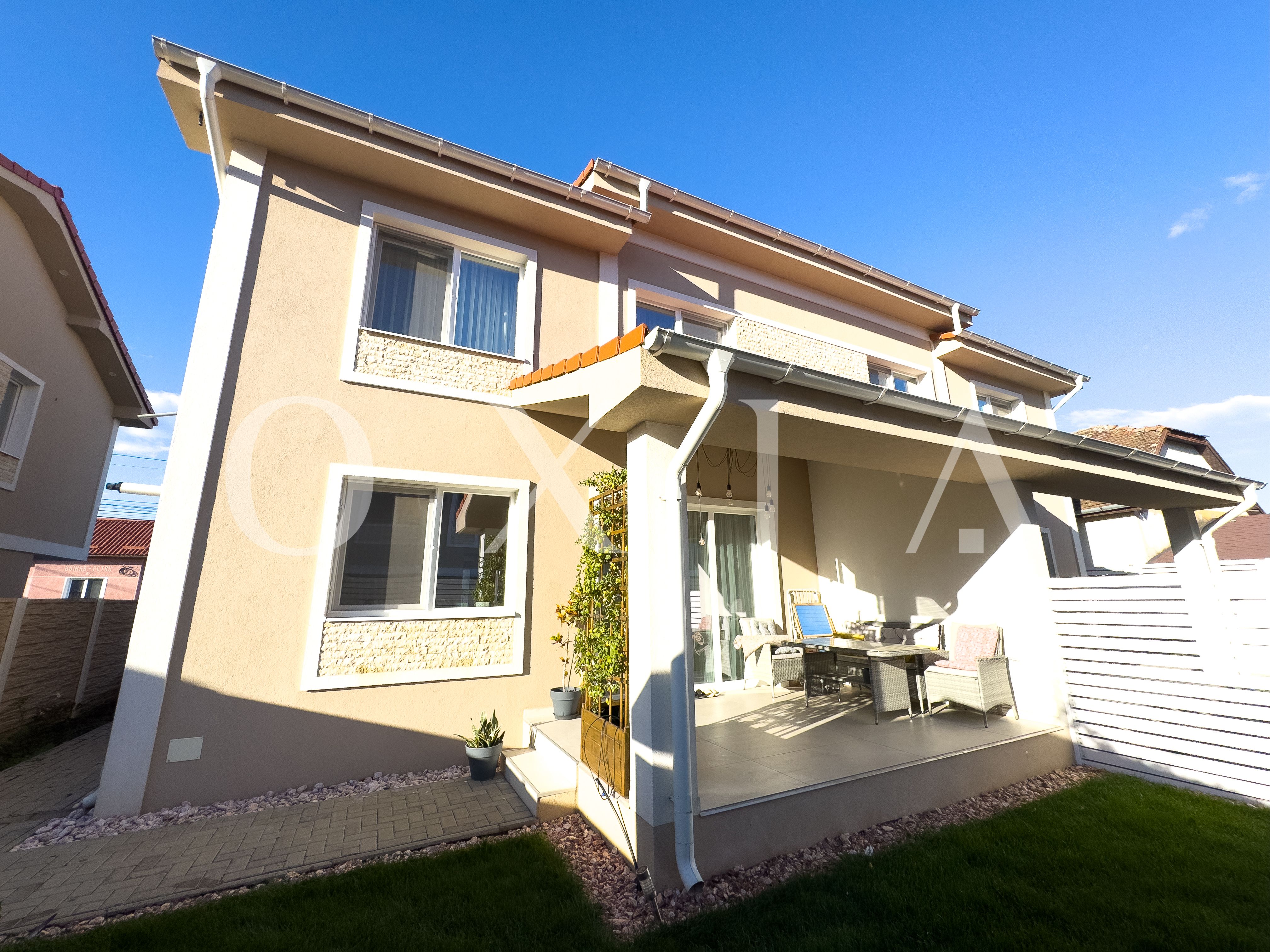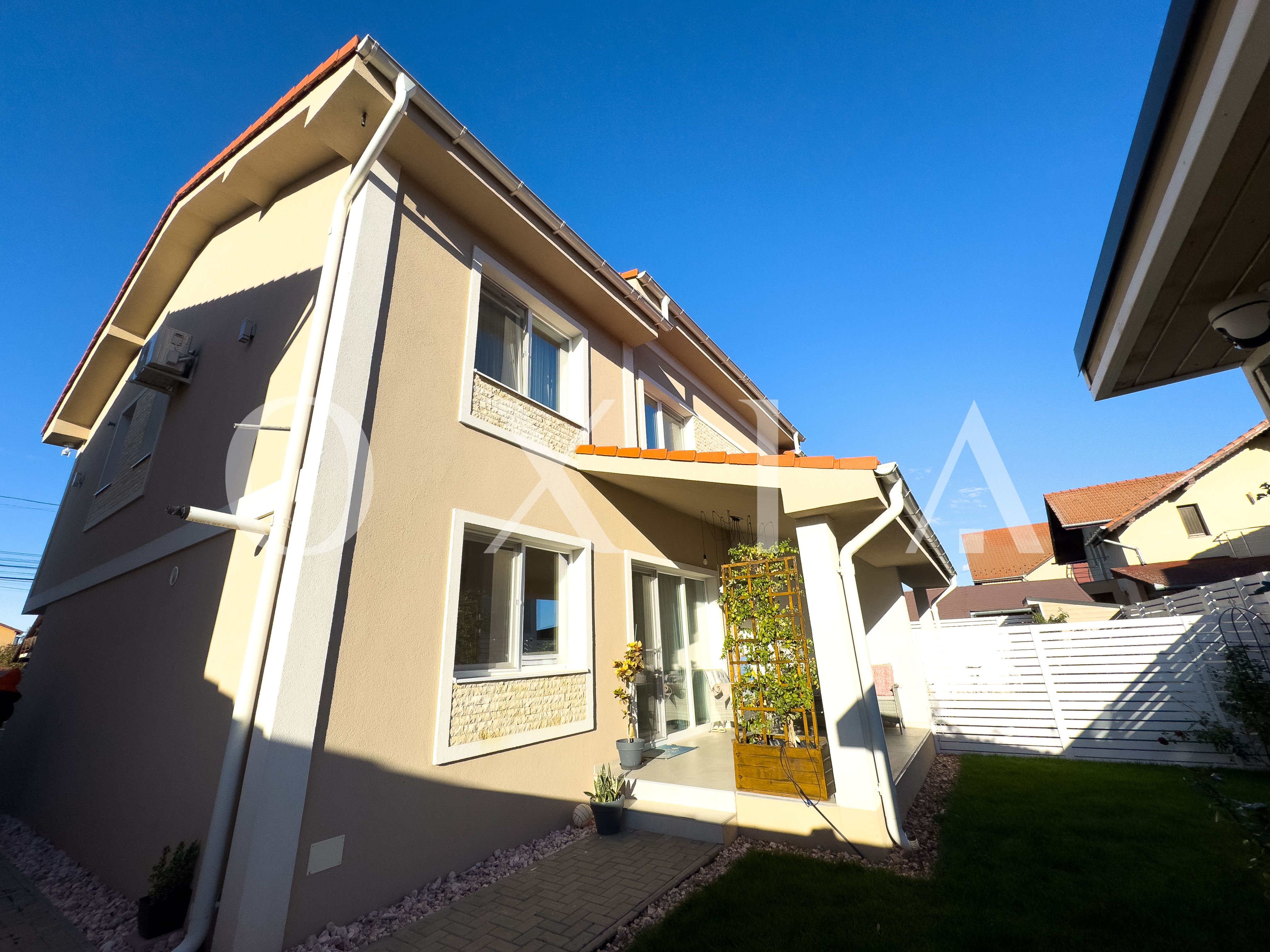 OXIA prezinta spre vanzare unitate in Duplex situat in Giroc, vatra satului, la asfalt, cu suprafata terenului de 200 mp, suprafata construita de 160 mp (amprenta casei la sol este de aproximativ 90 mp), suprafata utila de 120 mp + 17 mp terasa acoperita, compartimentata astfel: