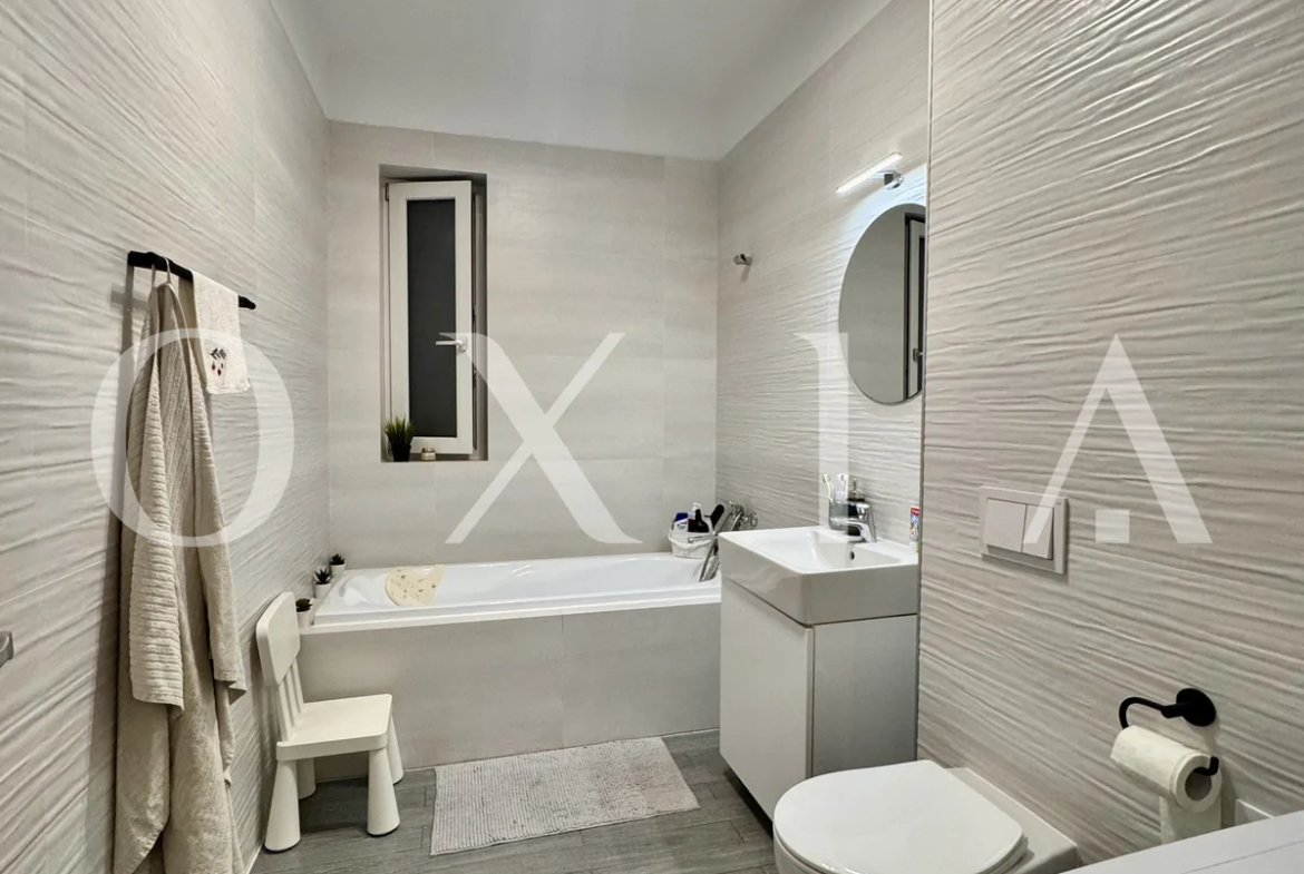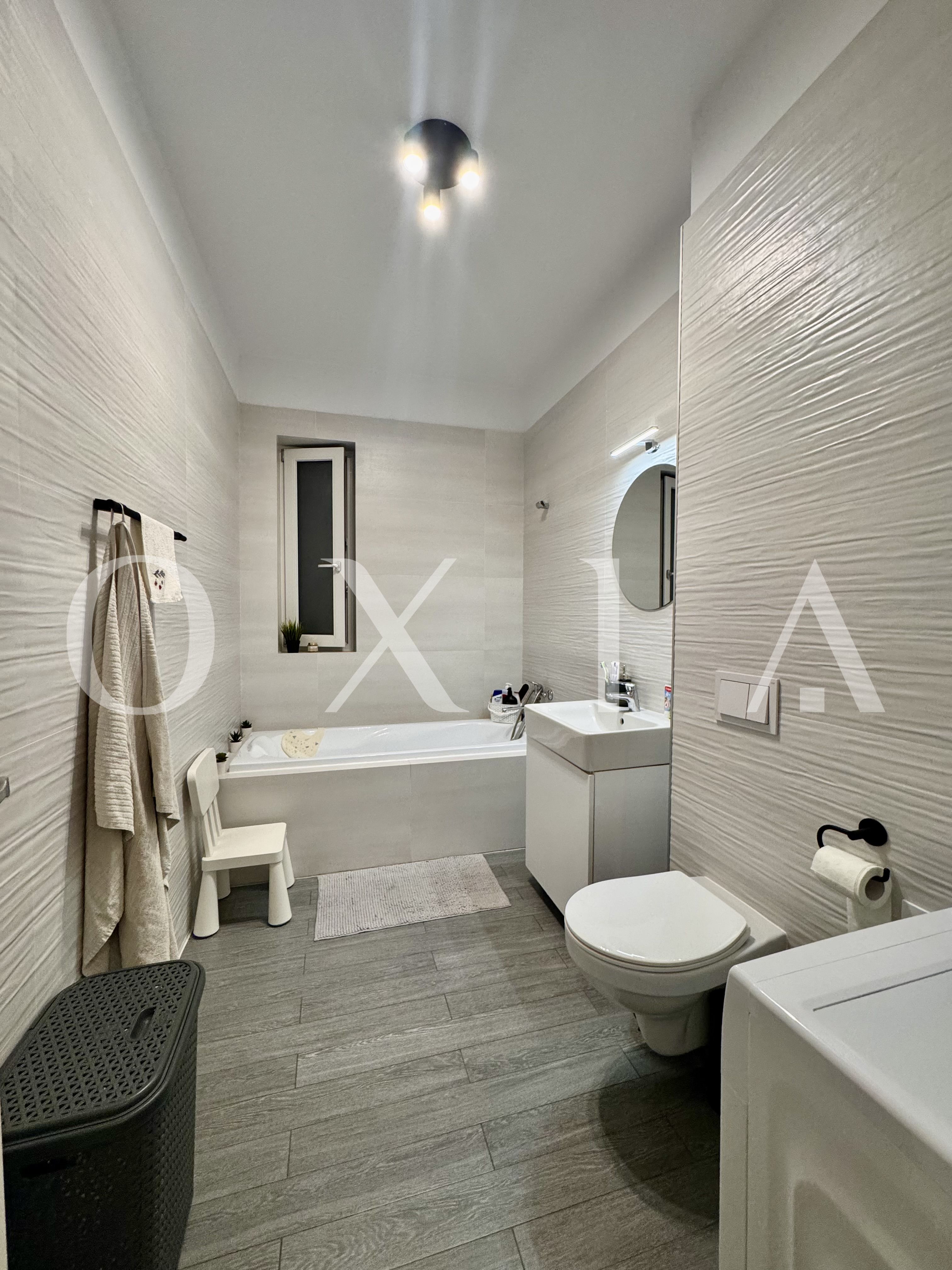 Baie moderna cu cada si geam pentru aerisire