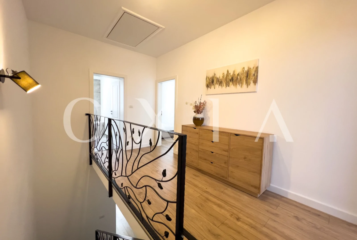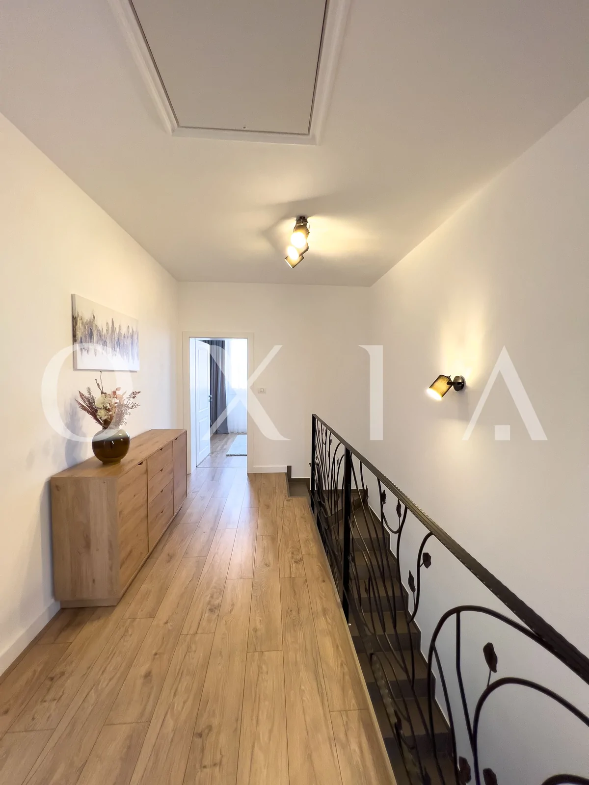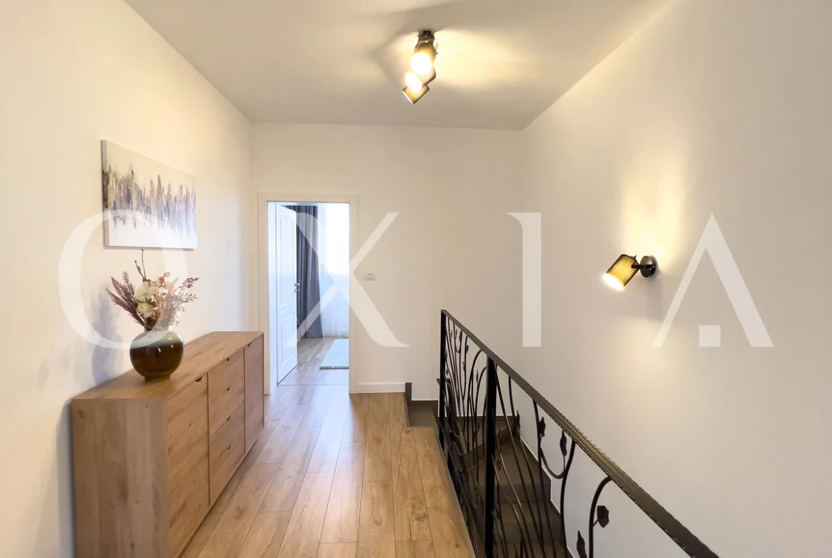 Etaj: hol foarte lat, 2 dormitoare fiecare cu dresing propriu, baie.