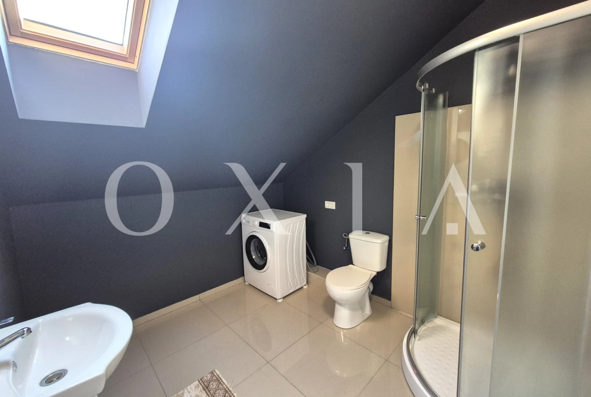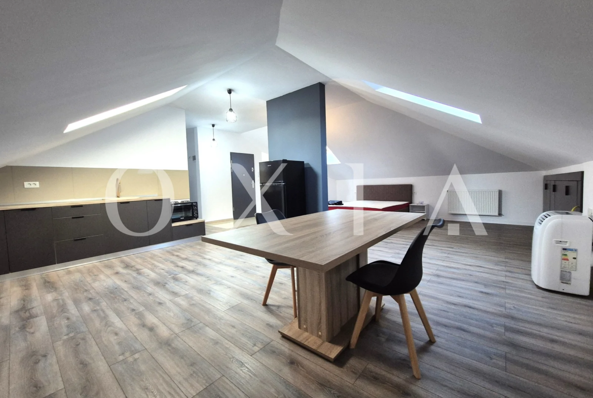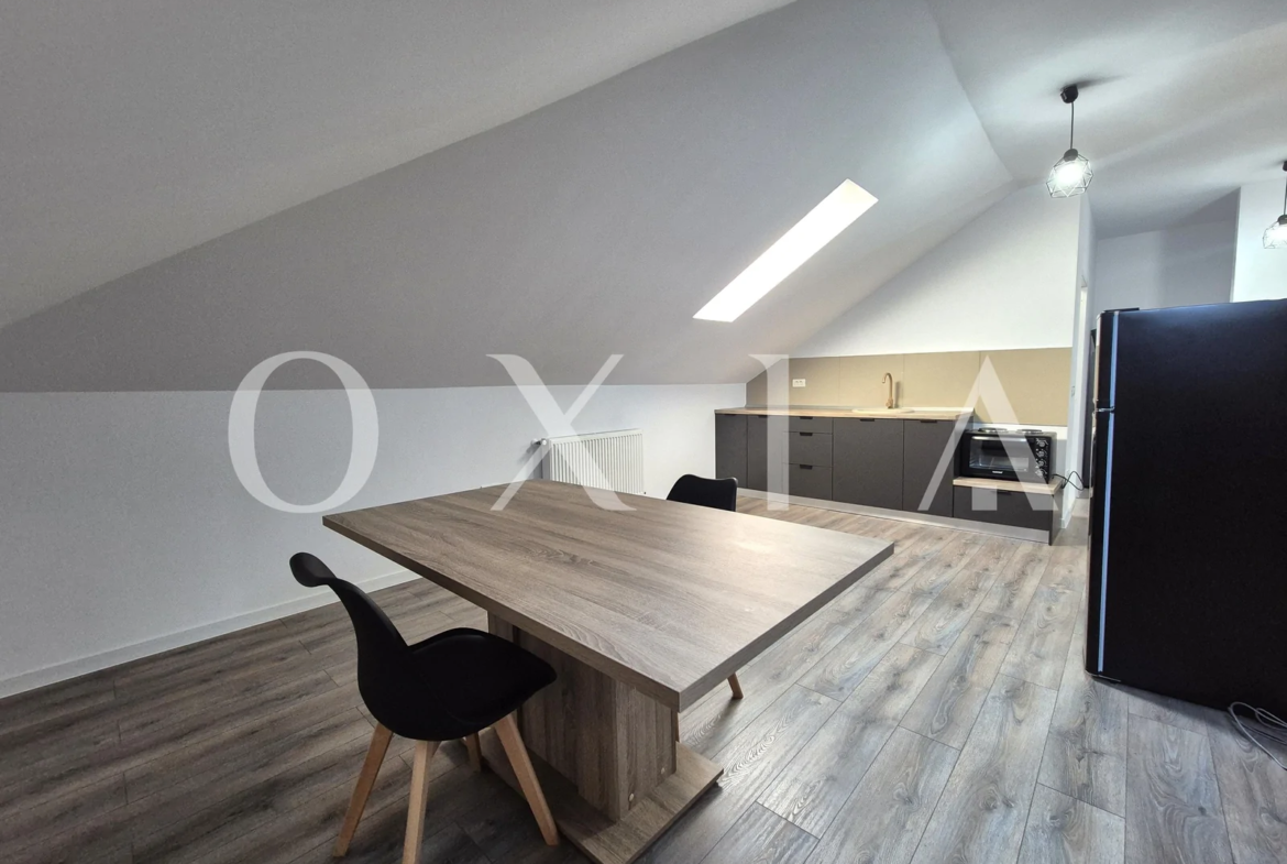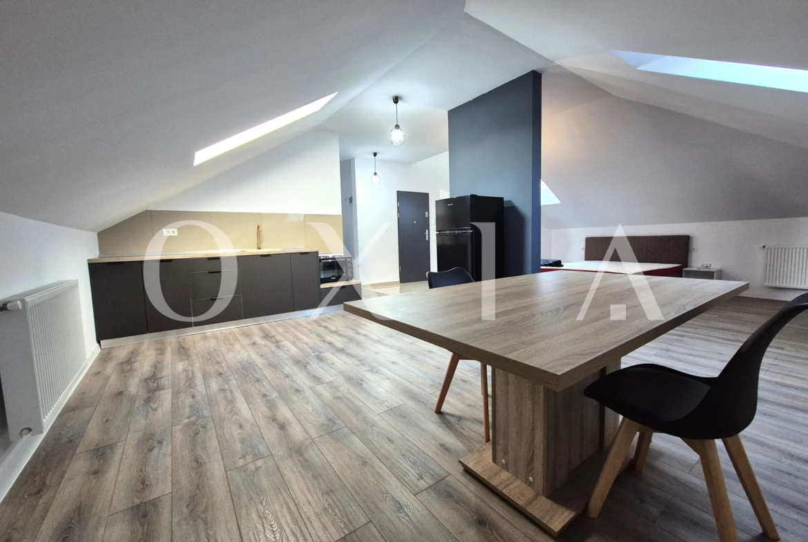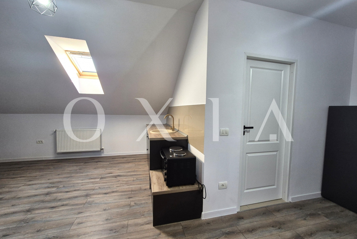 OXIA prezinta spre inchiriere apartament cu 1 camera – tip studio, situat in Giroc aproape de Hotel IQ, la mansarda unui bloc cu 2 etaje, constructie 2022, cu suprafata de 45 mp, compartimentat astfel: