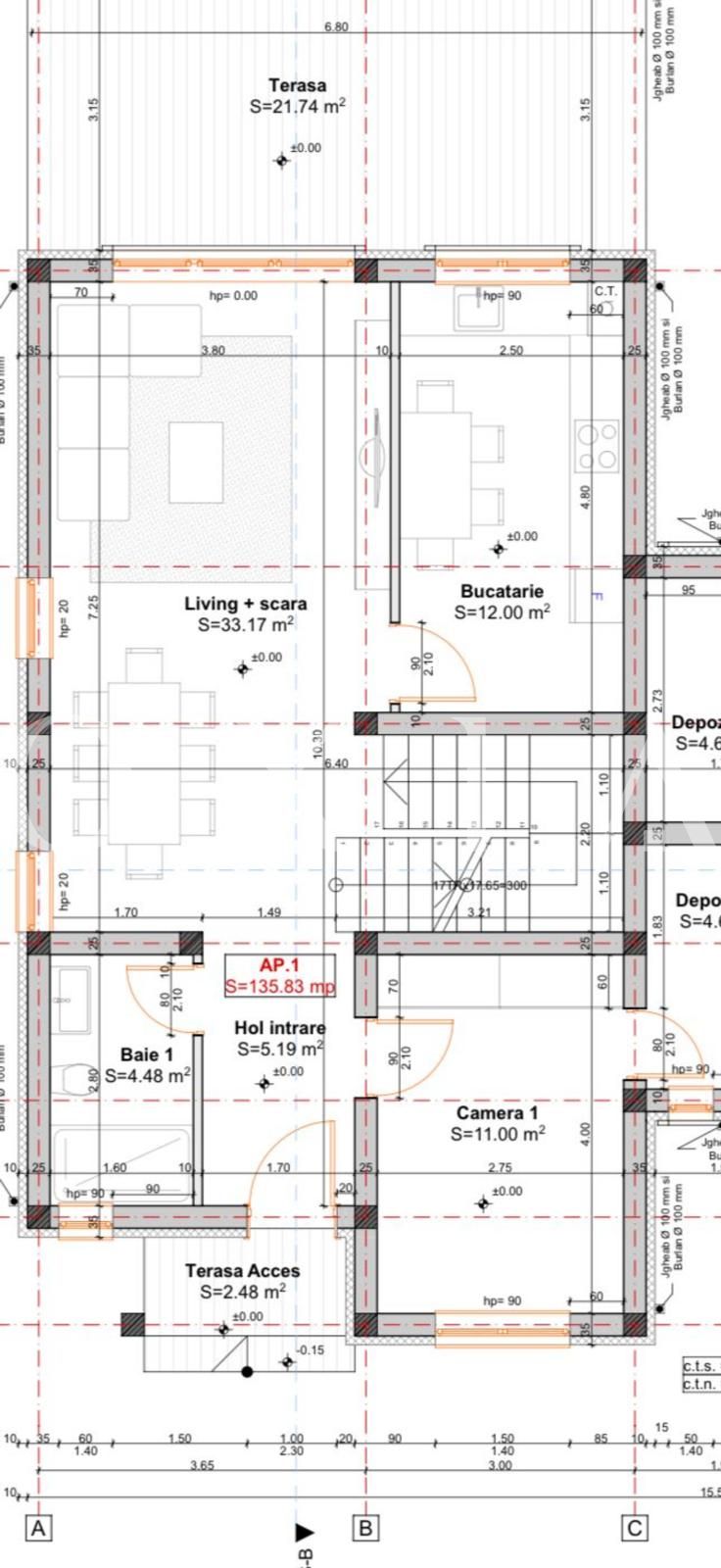 Duplexul este unit prin camera tehnica si are un regim de inaltime P+1E+Pod si dispune de o suprafata utila de 136 mp, fiind construita pe un teren de 310 mp.