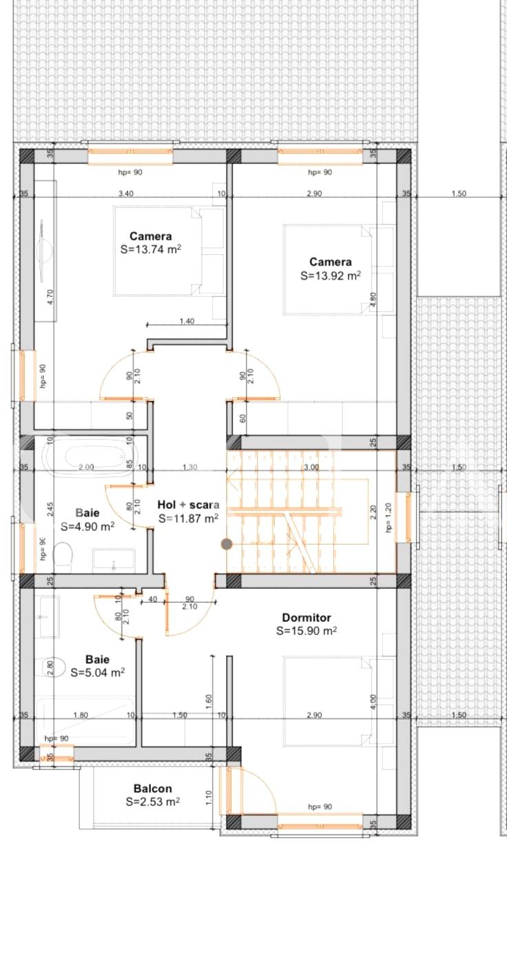 Etaj: dormitor matrimonial cu dressing, baie proprie si balcon, doua dormitoare secundare, baie cu cada.