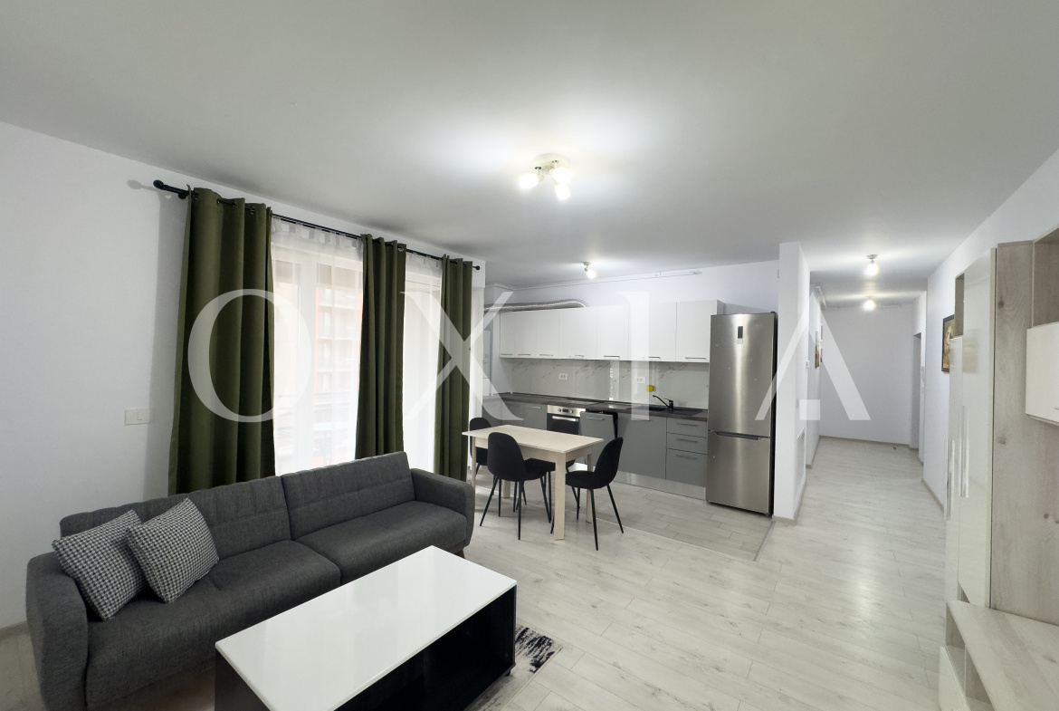 OXIA prezinta in exclusivitate spre inchiriere apartament cu 2 camere in Timisoara, zona Aradului, situat in complexul rezidential Iris Armonia, la etajul 5, imobil cu 2 lifturi pe scara, decomandat, cu suprafata de 53 MP utili, compartimentat astfel: