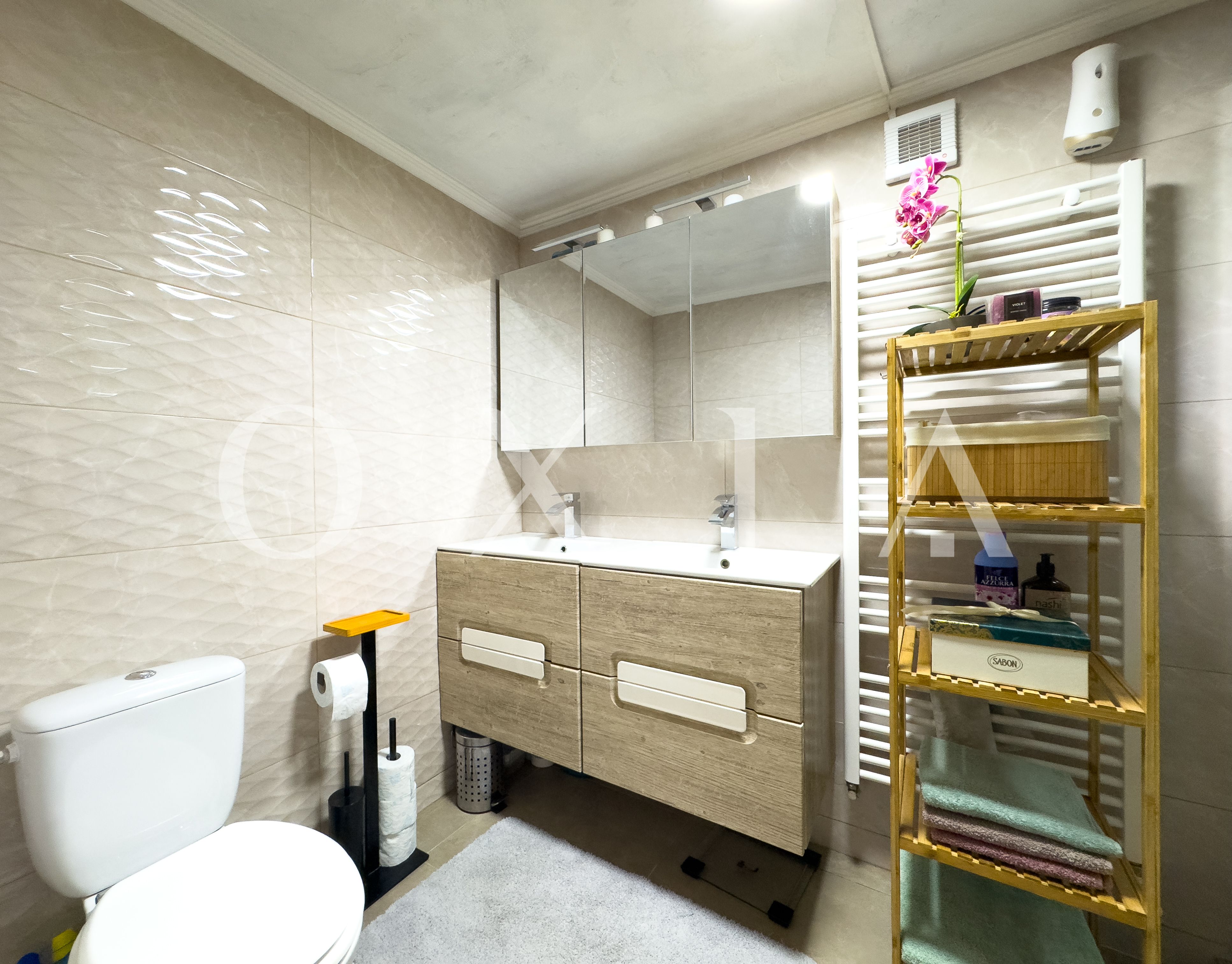 Baie moderna dotata cu cabina de dus si sistem de ventilatie