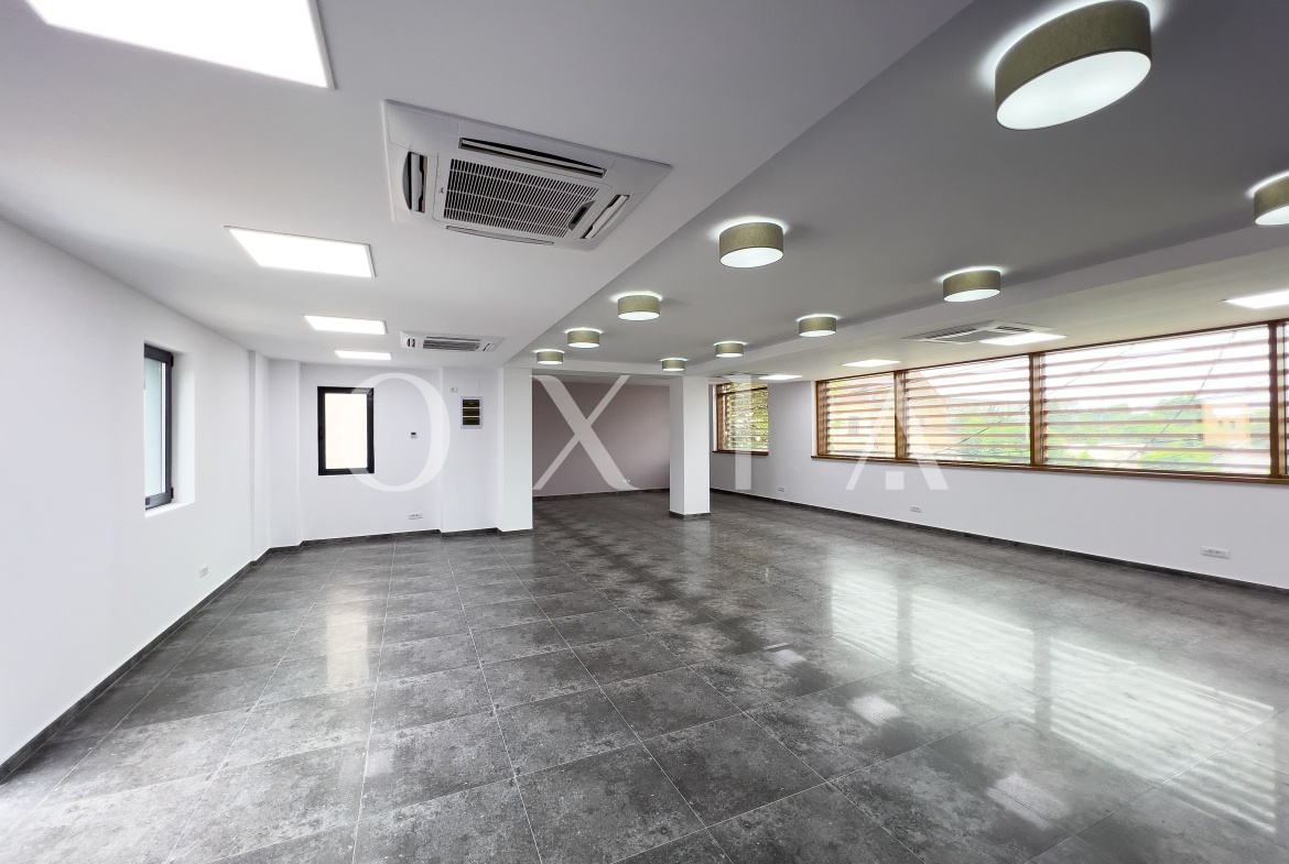 Biroul este situat la etajul 1, cu o suprafata de 99.5 mp, oferind un spatiu open space generos, grup sanitar si chicineta. Designul si amenajarile sale de calitate creeaza un mediu de lucru placut si eficient.