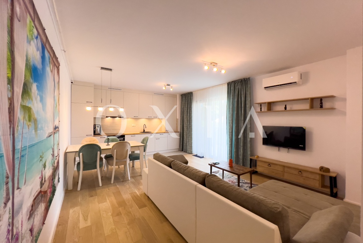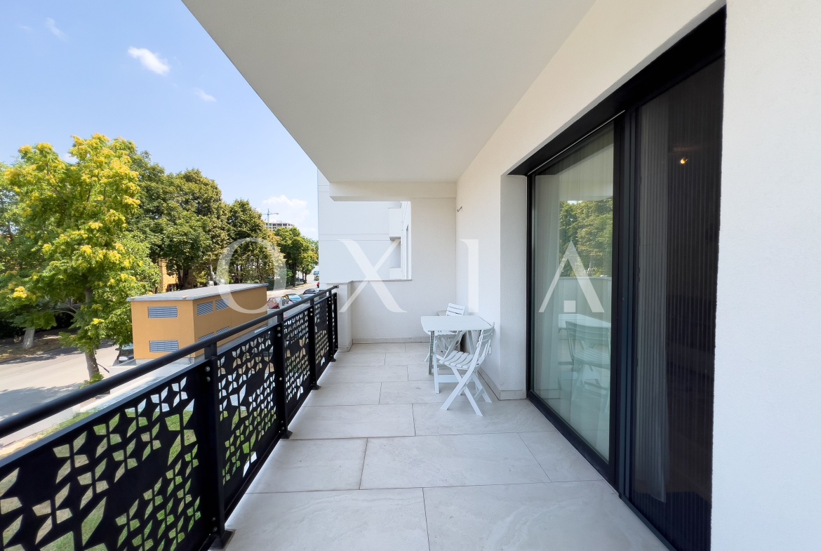 OXIA prezinta spre inchiriere apartament cu 2 camere, situat in Timisoara, complex rezidential Monarch (Circumvalatiunii), la etajul 1/6, imobil dotat cu lift, semidecomandat, cu suprafata de 55 mp utili+12 mp terasa, compartimentat astfel: