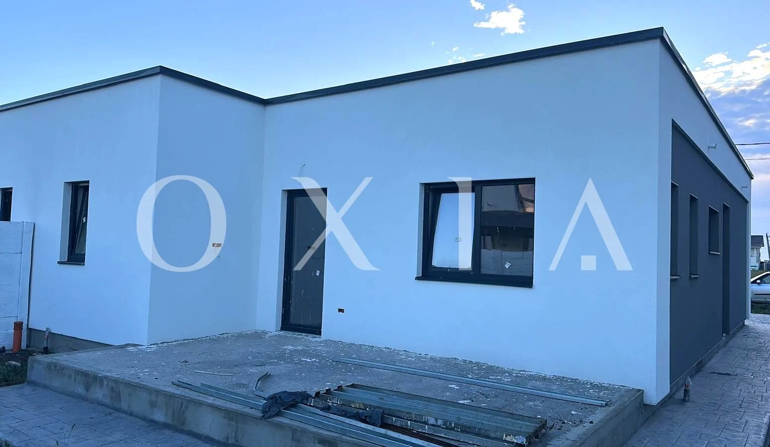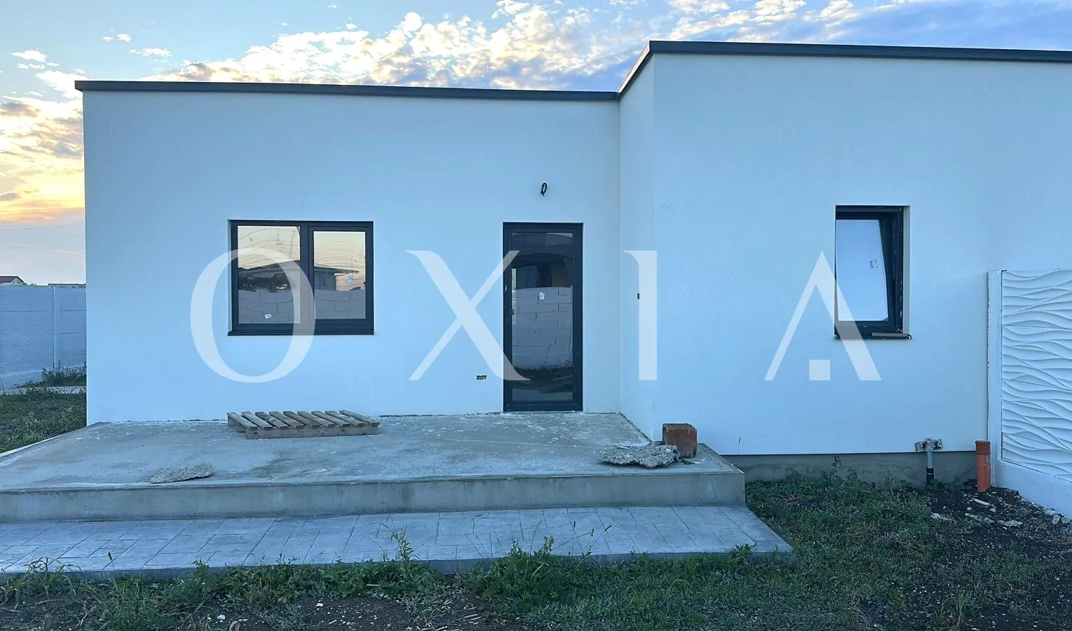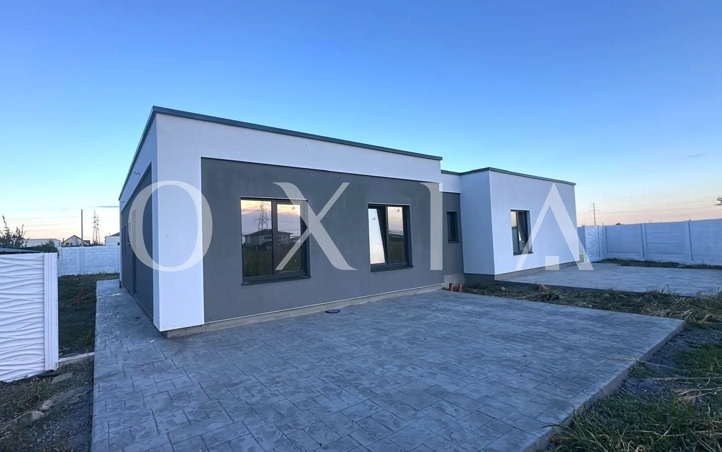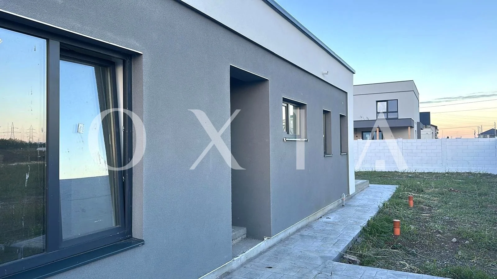 Casa este construita din caramida poroterm, izolata cu polistiren de 10 cm, acoperis tip terasa.