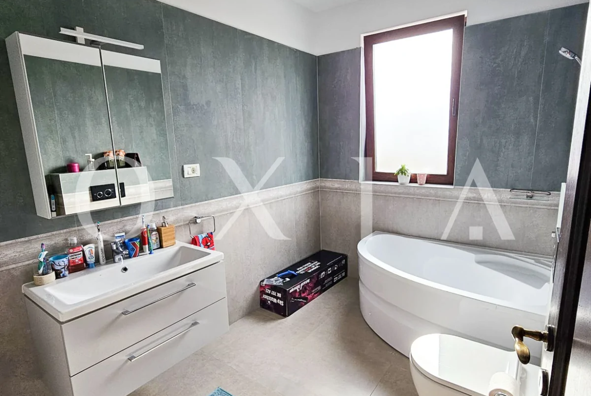 Imobilul este construit cu materiale de calitate, geamuri termopan cu 3 sticle, finisaje premium ( ferestre PVC cu geamuri tripane, parchet triplustratificat din stejar, travertiv, usi interioare lemn de stejar, vopsea lavabila, etc.