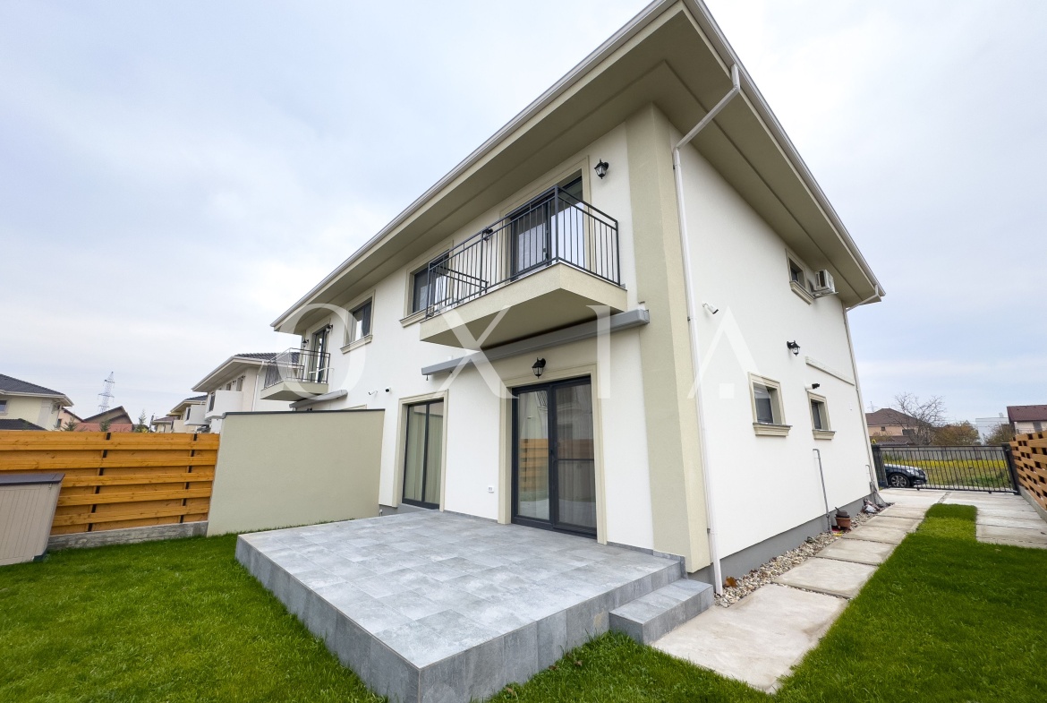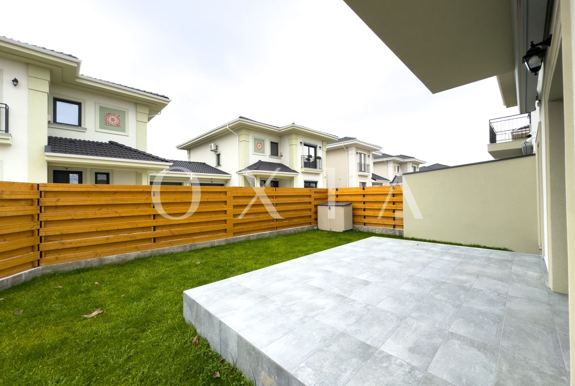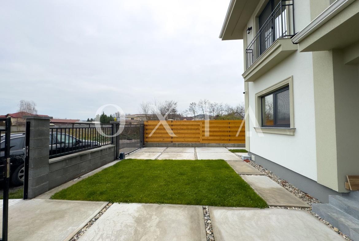 Spatiul exterior este amenajat cu gazon si aspersoare, dispune de acces auto electric pentru doua masini, sistem de alarma si supraveghere video.
