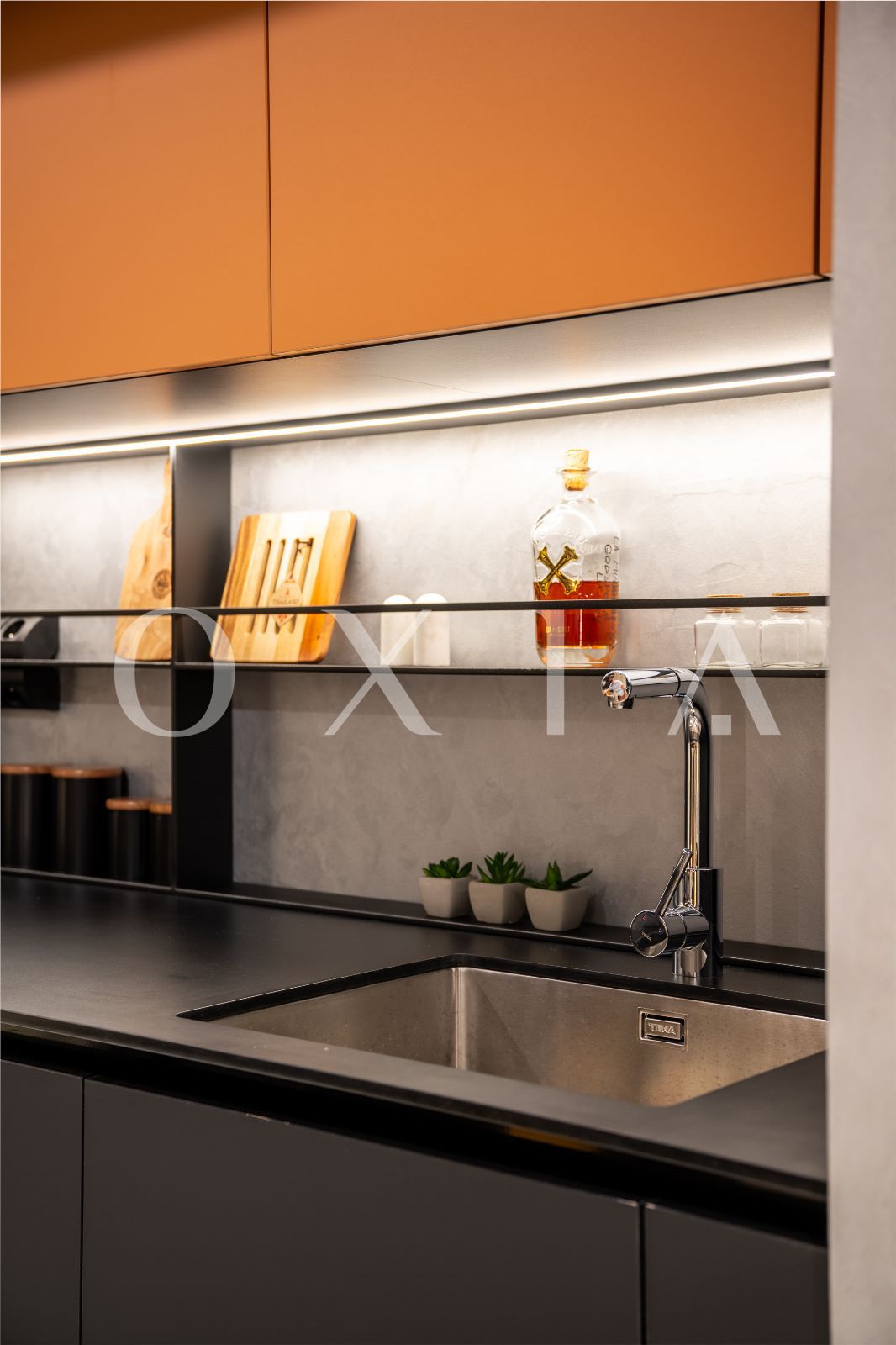 * Bucatarie complet utilata din MDF anti-amprenta cu inchideri soft-close si sistem iluminat LED in sertare si pe zonele de lucru;