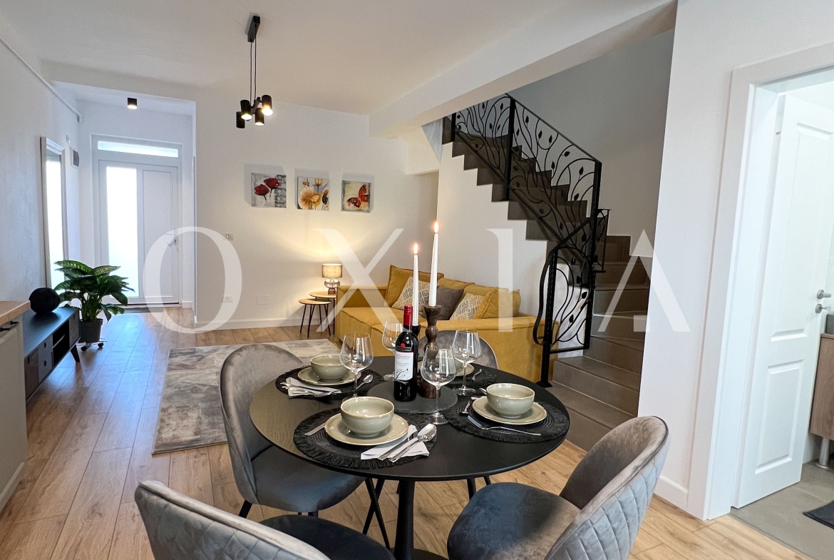 OXIA prezinta in exclusivitate casa P+E situata in ansamblu rezidential, in Giroc, cu suprafata terenului de 130 MP, suprafata utila de 91 MP + 14 MP terasa, compartimentata astfel:
