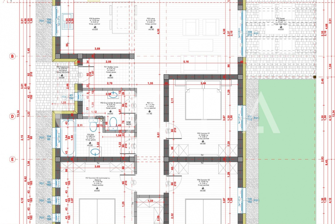 Imobilul este construit din caramida Porotherm de 25 cm, cu izolatie exterioara din polistiren EPS 80 Caparol de 15 cm, pereti interiori din caramida, fundatie termoizolata si placa din beton armat de 20 cm peste pod, oferind durabilitate si eficienta termica.