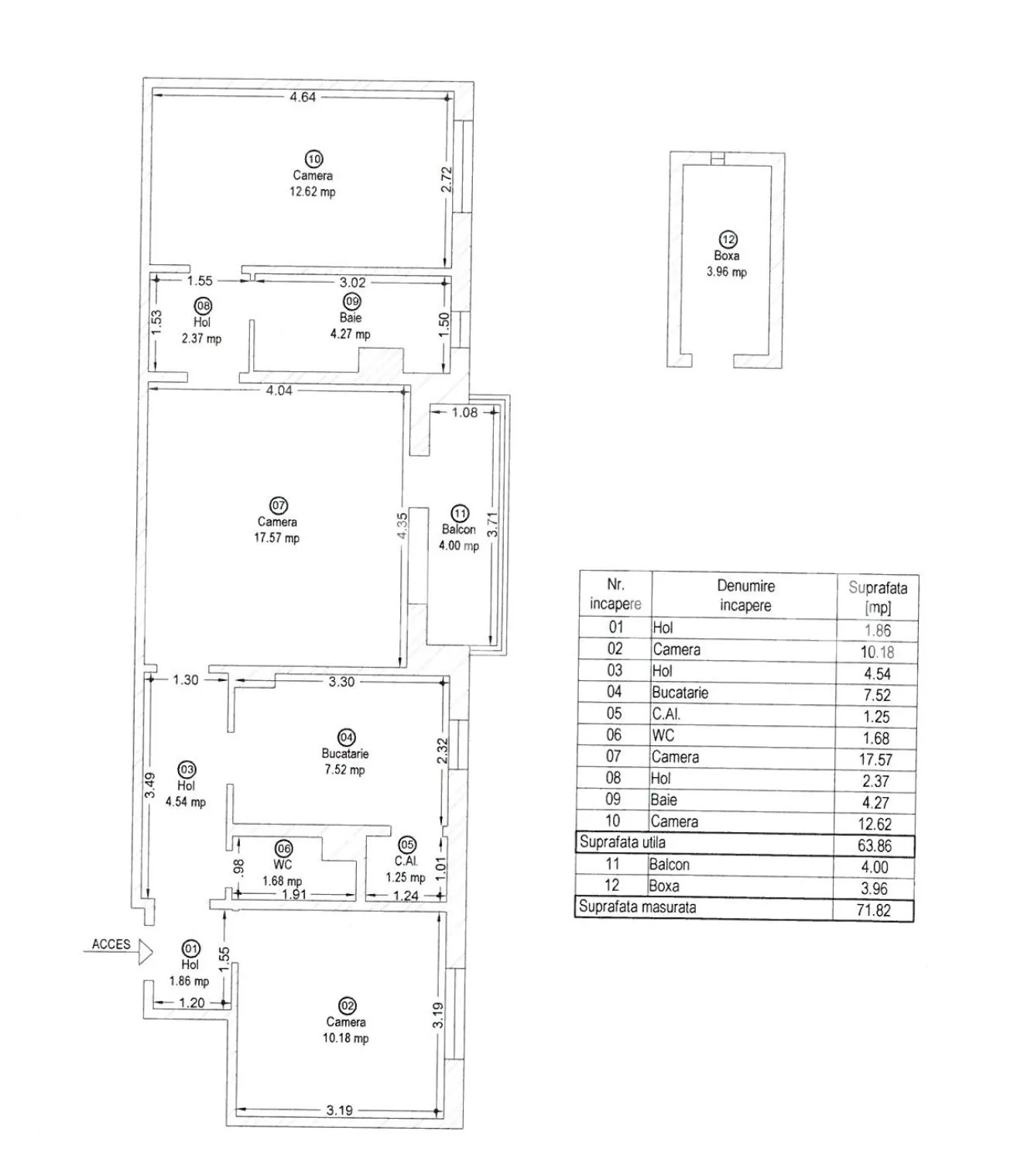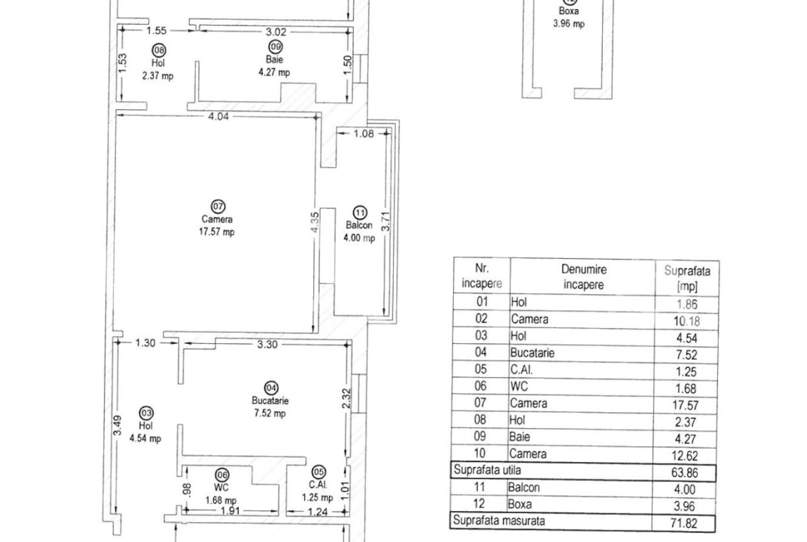 Dispune de o boxa proprie la subsolul tehnic al imobilului in suprafata de 4.59 MP notata in cartea funciara.