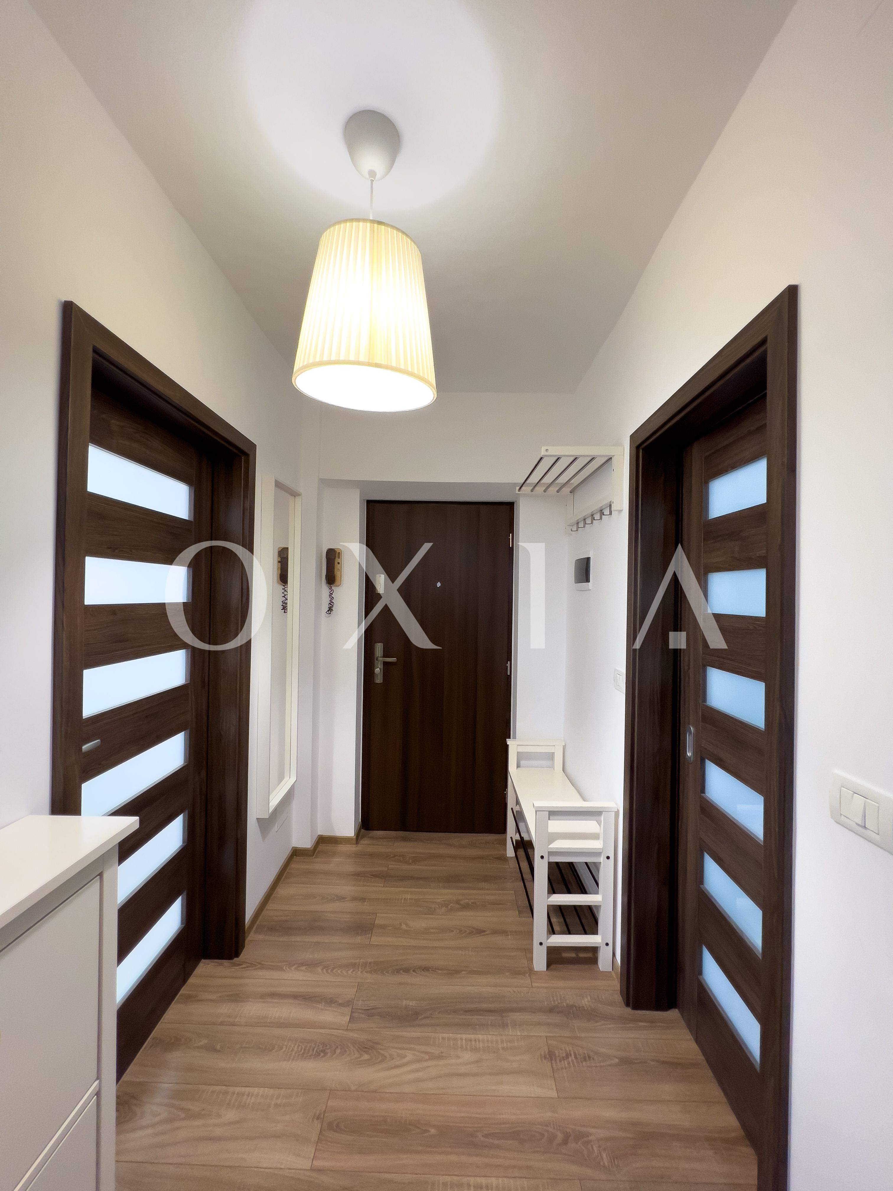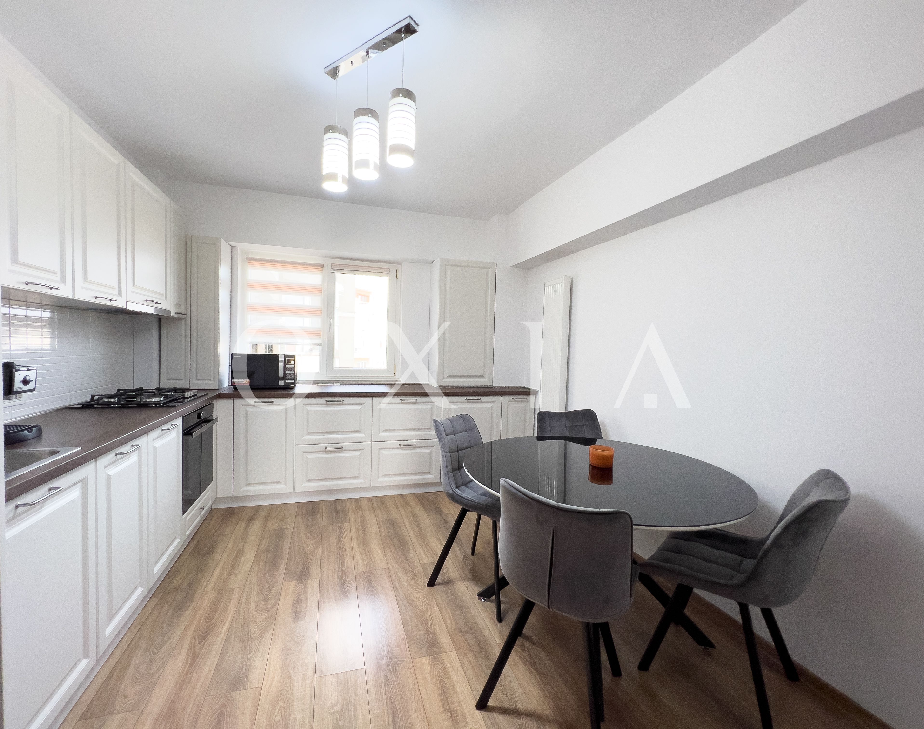 Apartamentul este renovat complet si beneficiaza de amenajari moderne: usa intrare metalica antiefractie Porta Doors, usi interioare Porta Doors, placi de gresie/faianta, parchet laminat, ferestre PVC cu geam termopan, vopsea lavabila, izolatie interioara, etc.